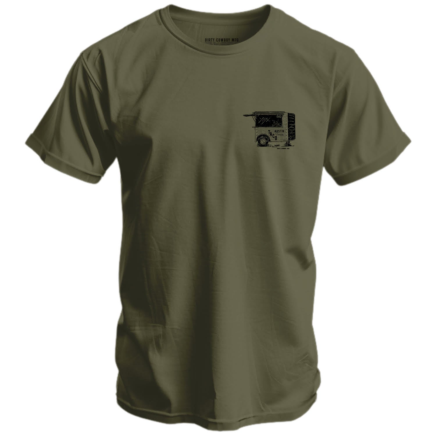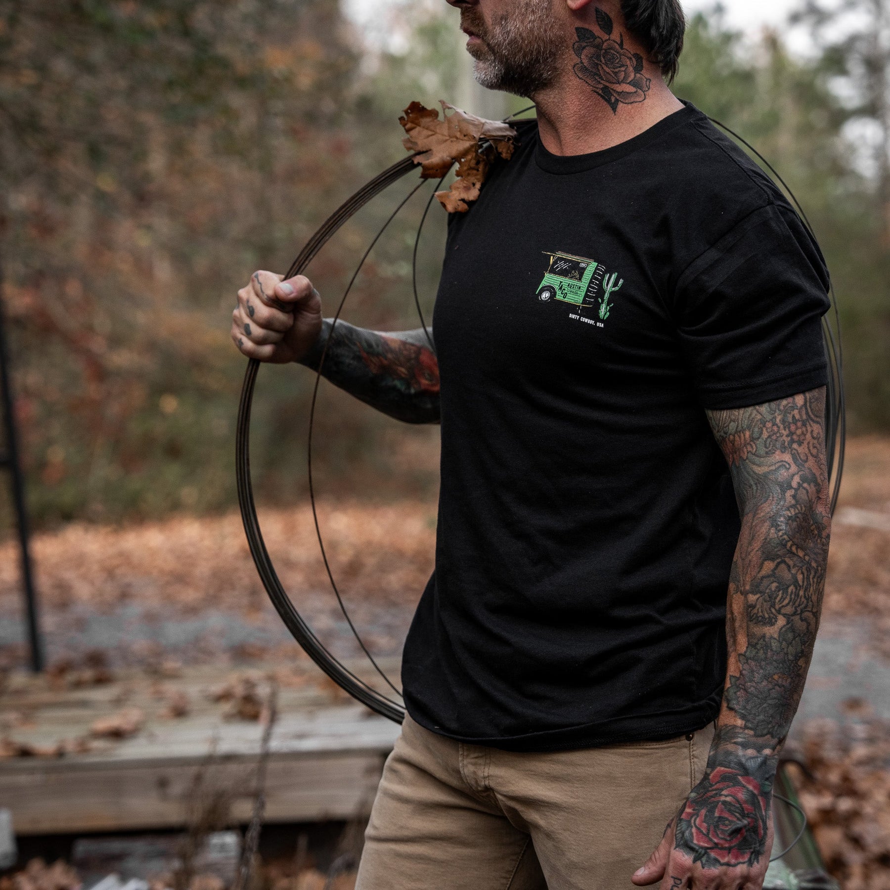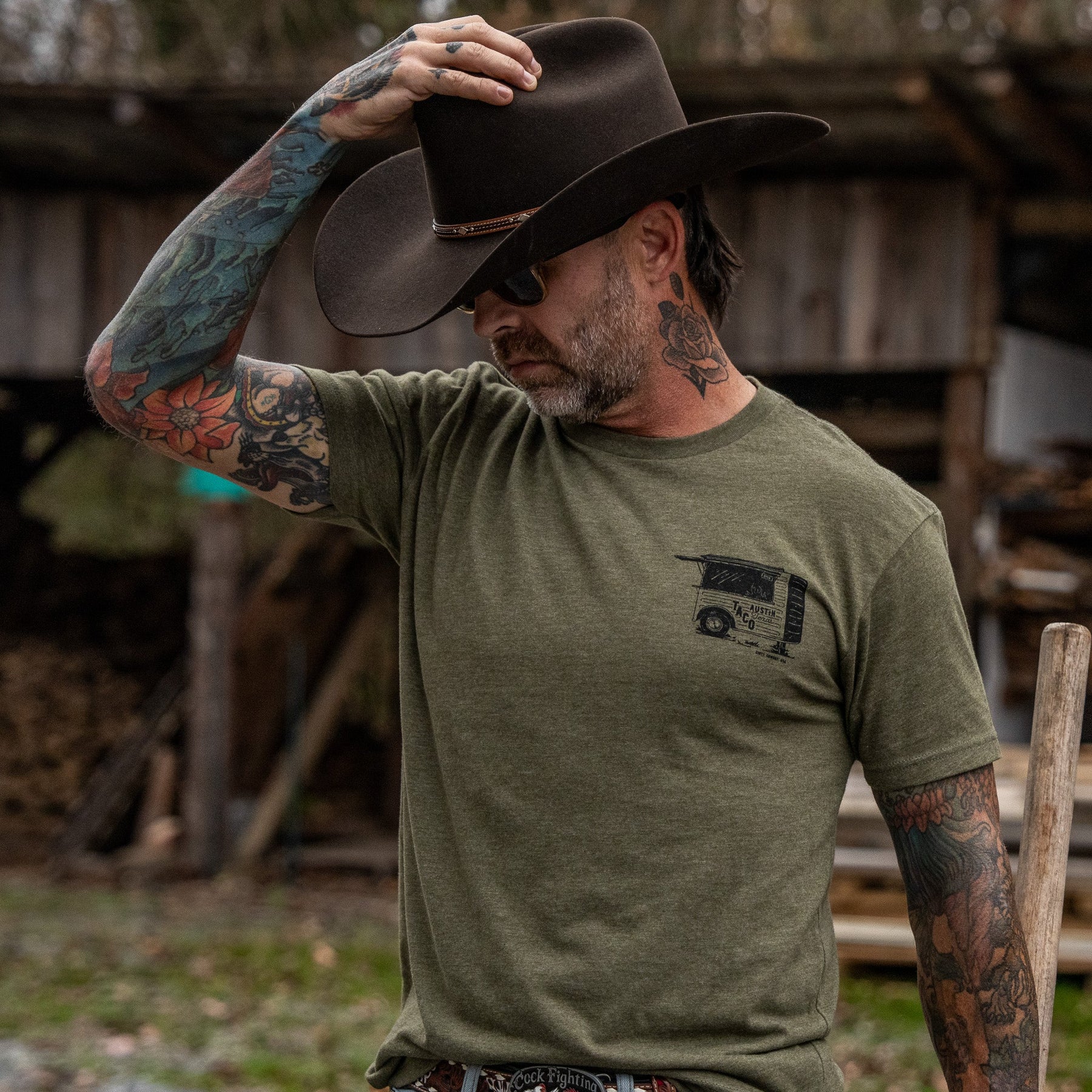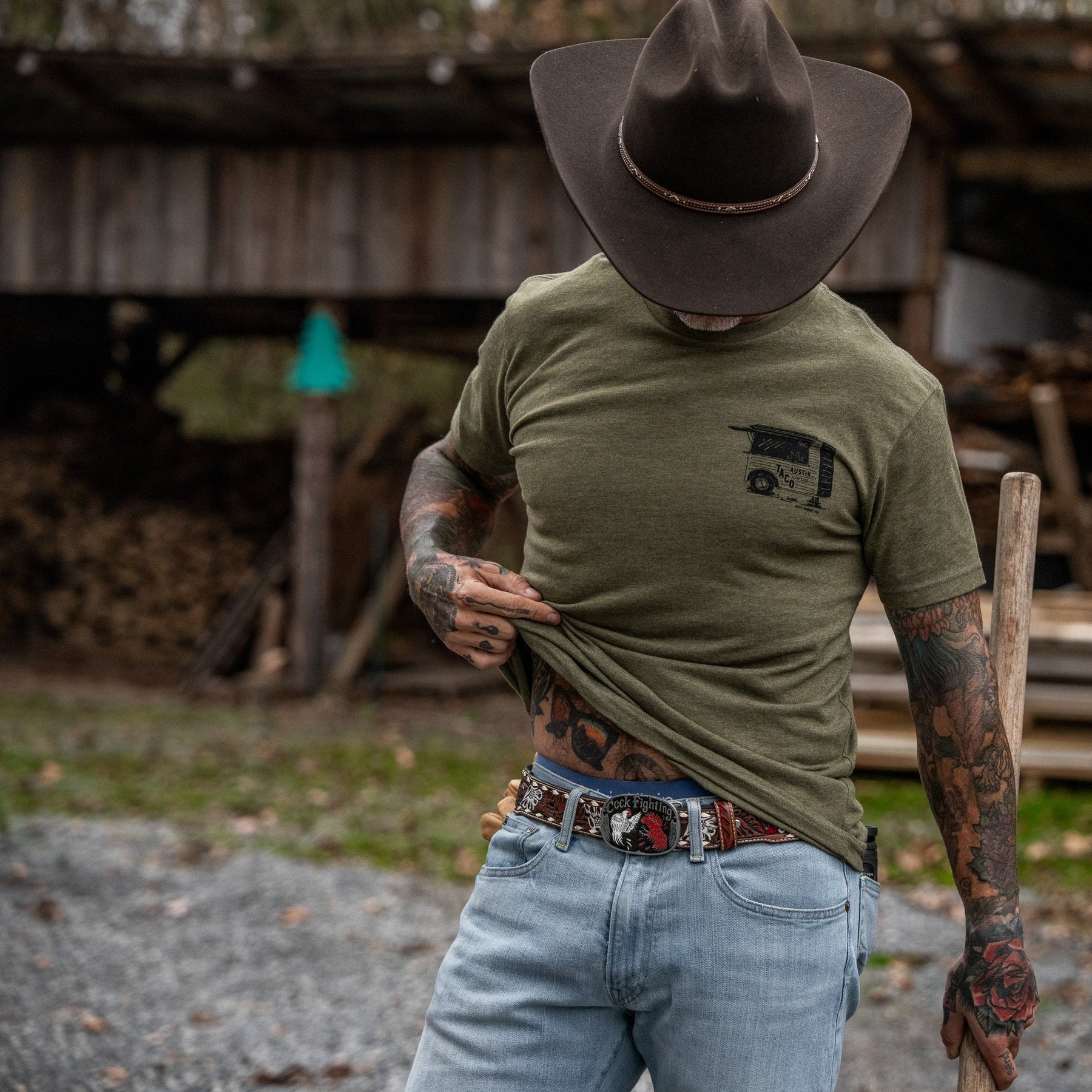 Our tees are made with a 60/40 cotton-poly blend — soft enough to feel broken-in from day one, but tough enough to stand up to real life.