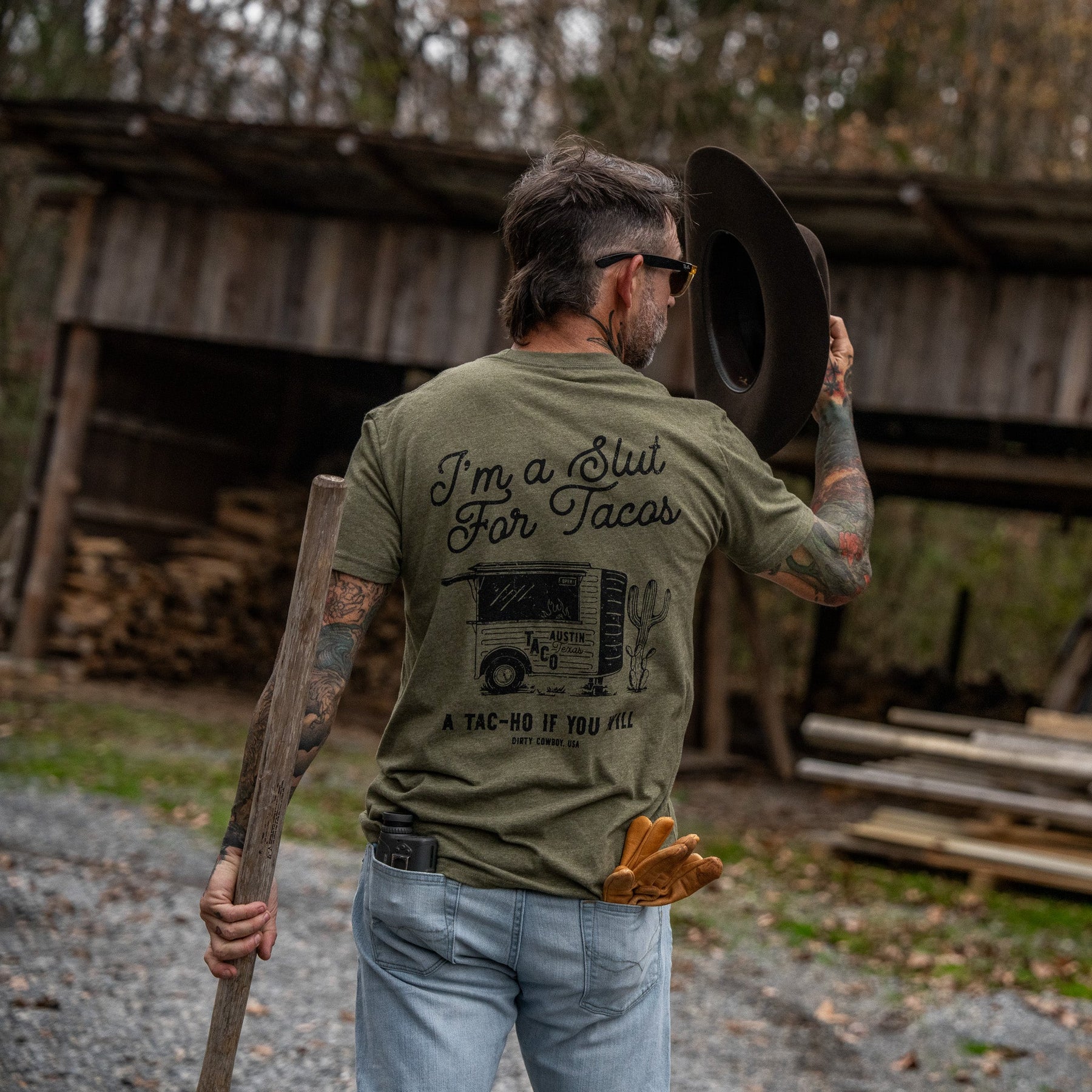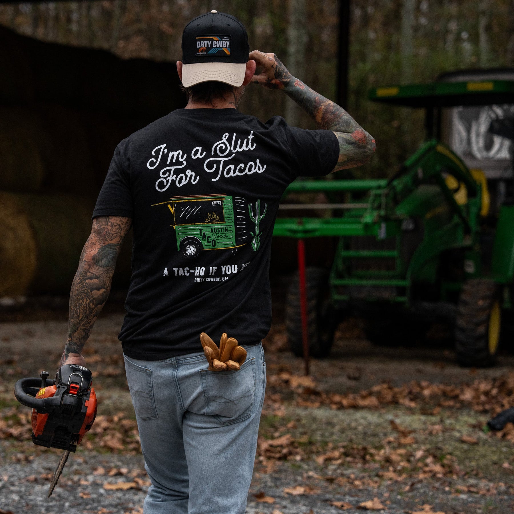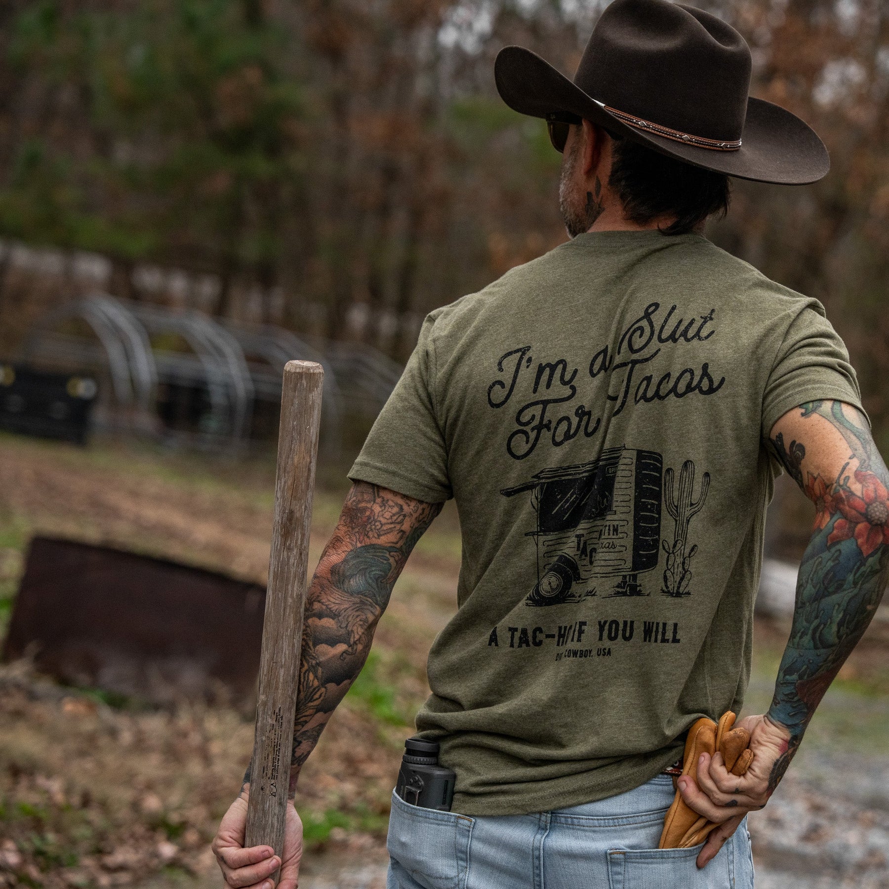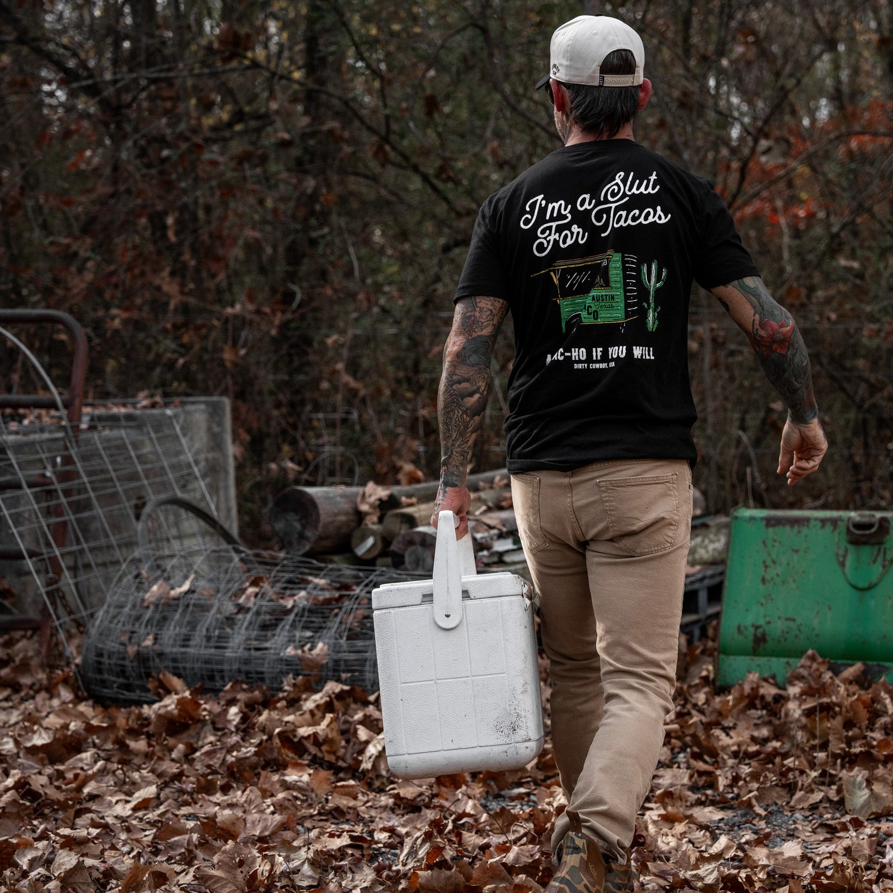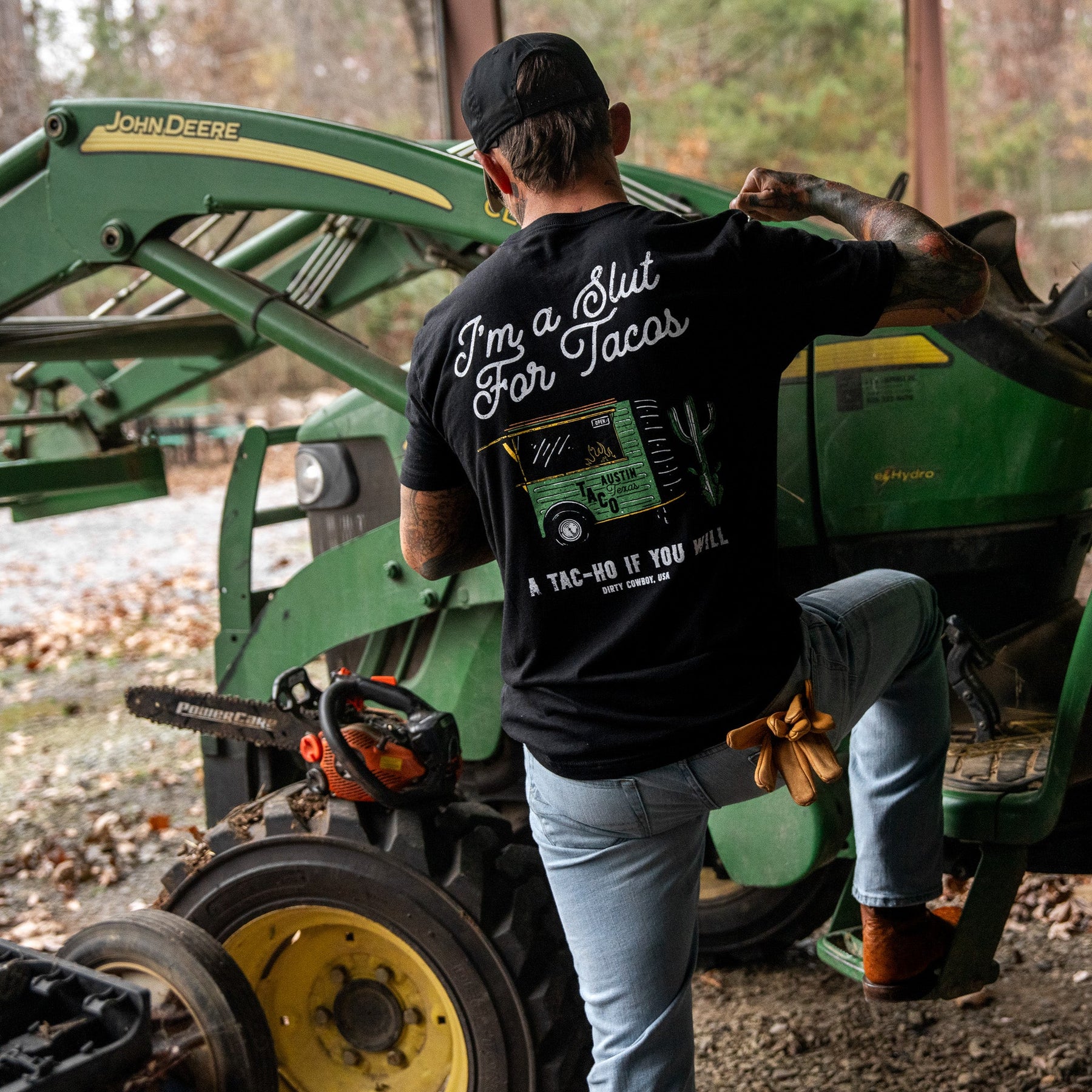Our tees are made with a 60/40 cotton-poly blend — soft enough to feel broken-in from day one, but tough enough to stand up to real life.