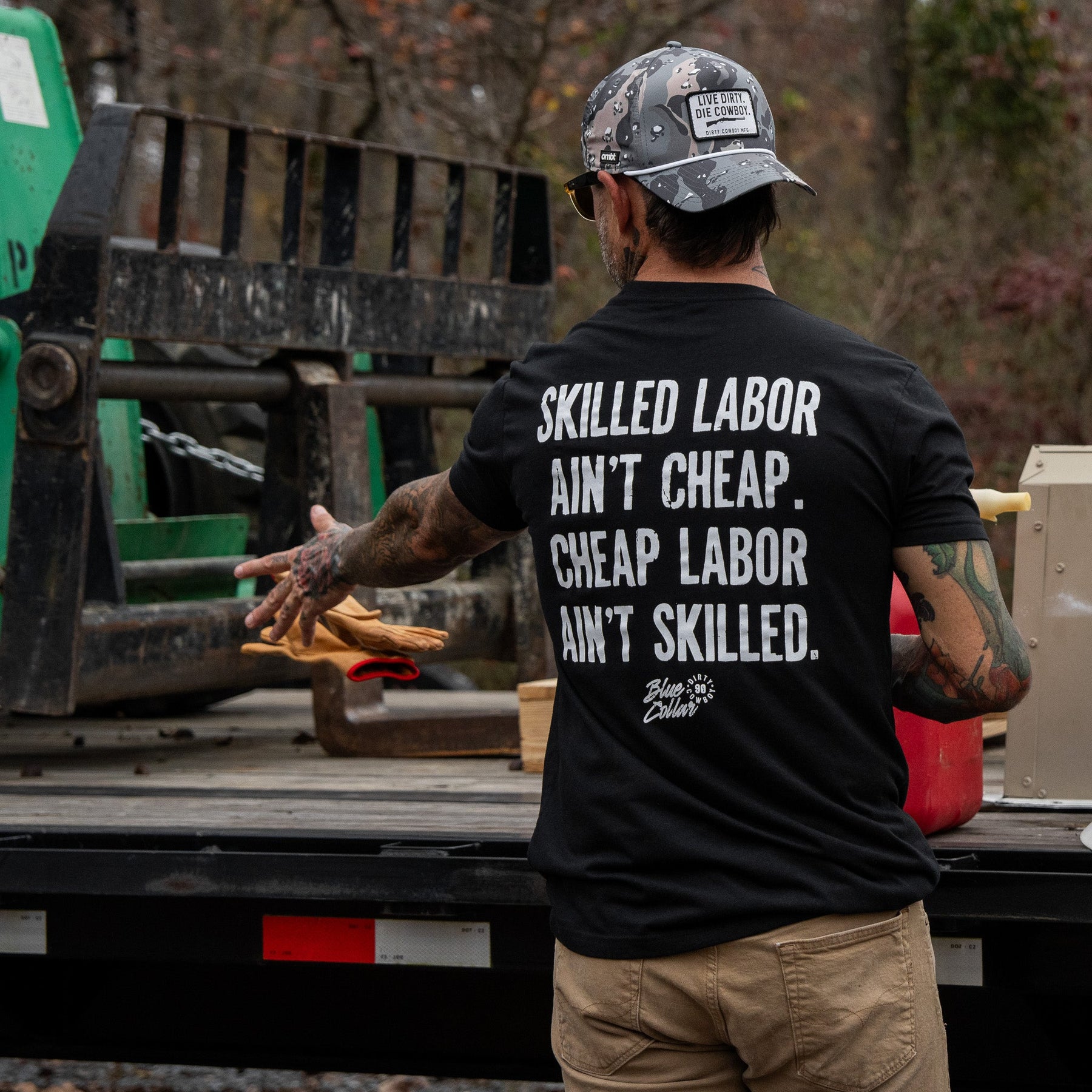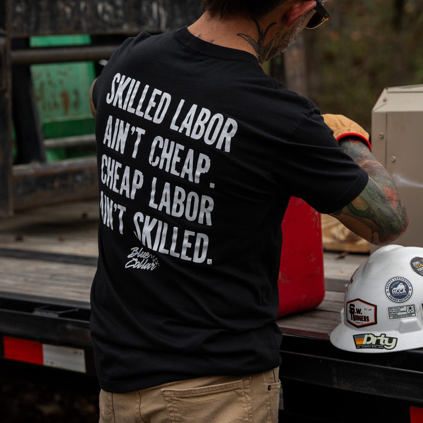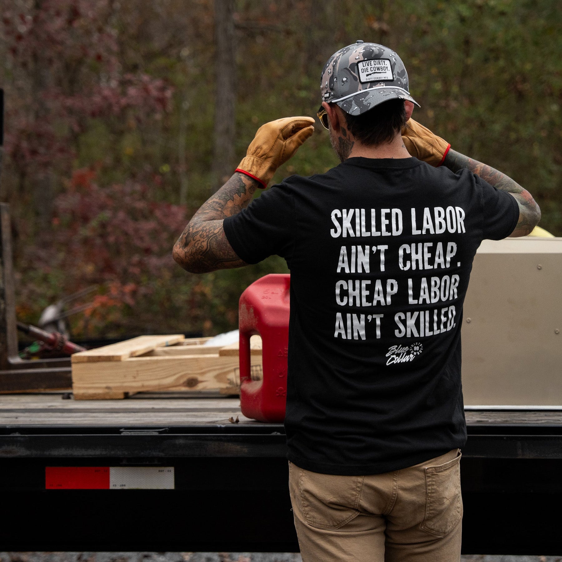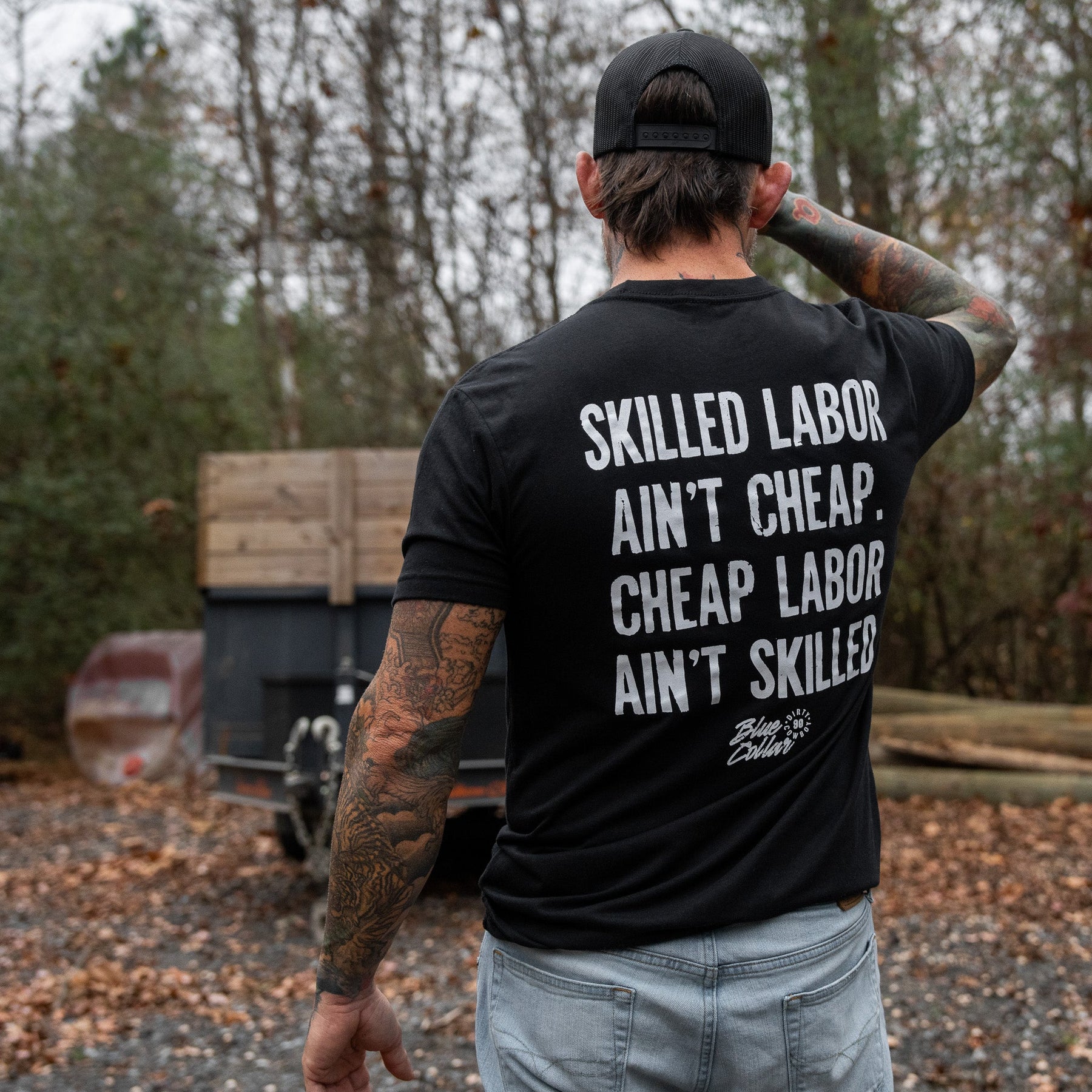 Our tees are made with a 60/40 cotton-poly blend — soft enough to feel broken-in from day one, but tough enough to stand up to real life.