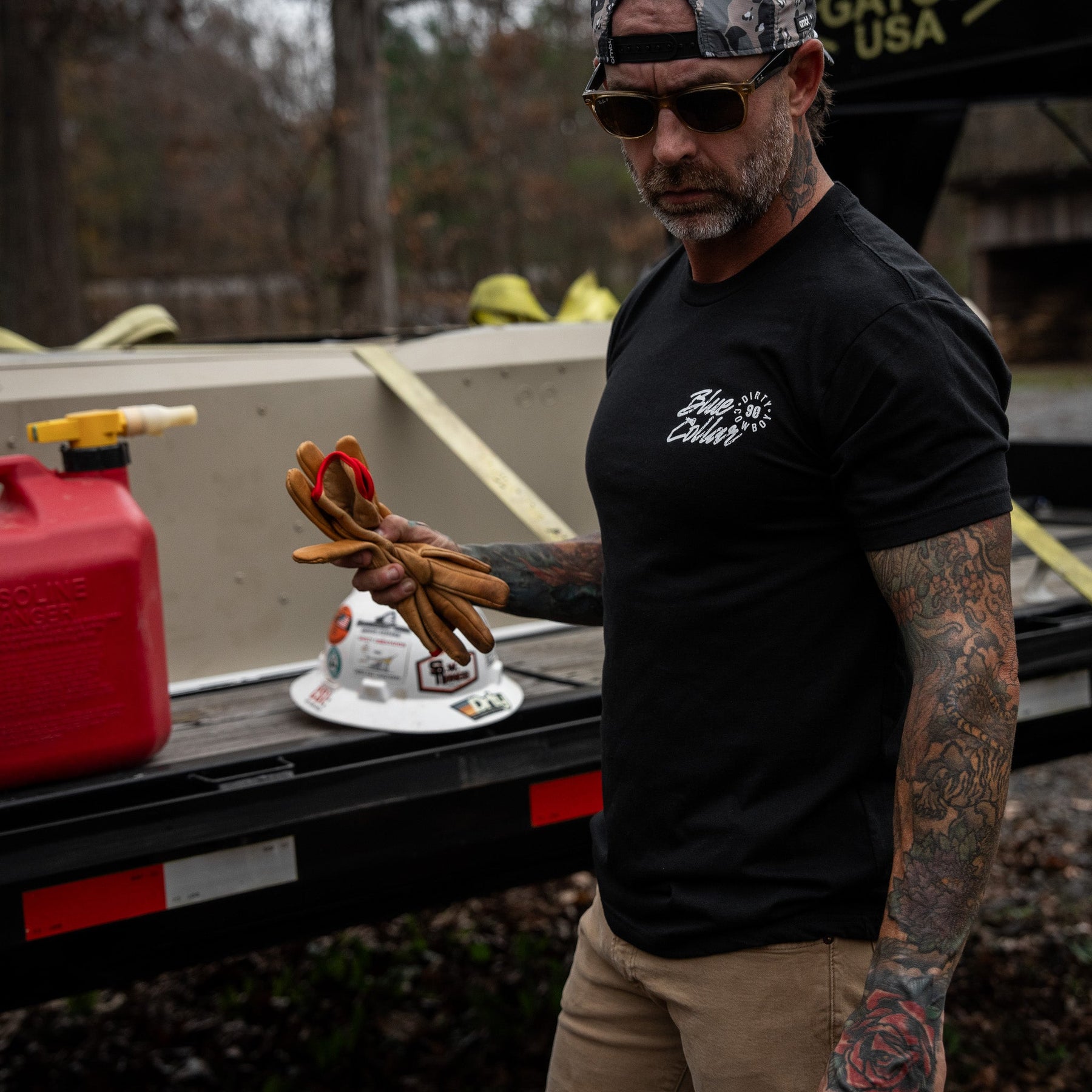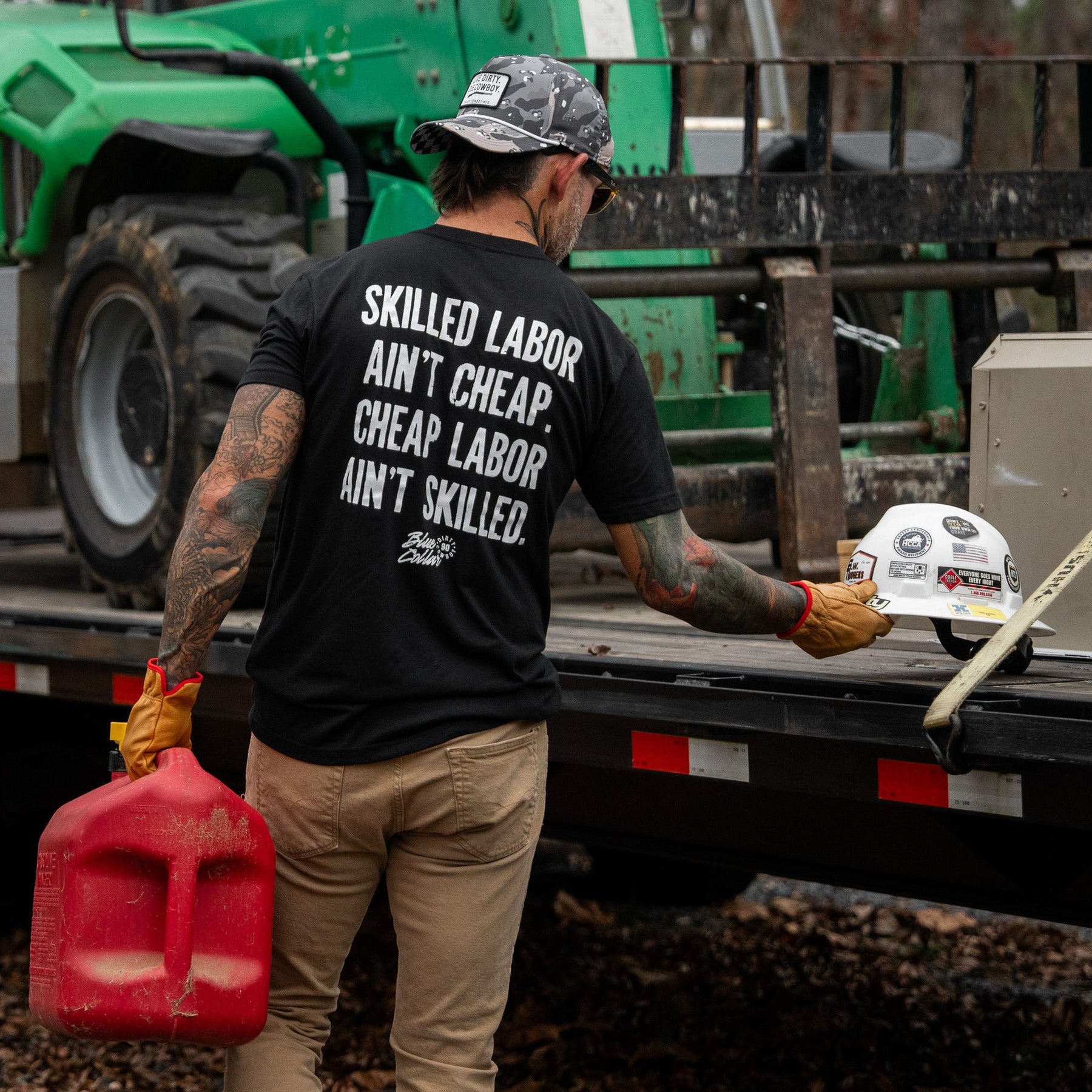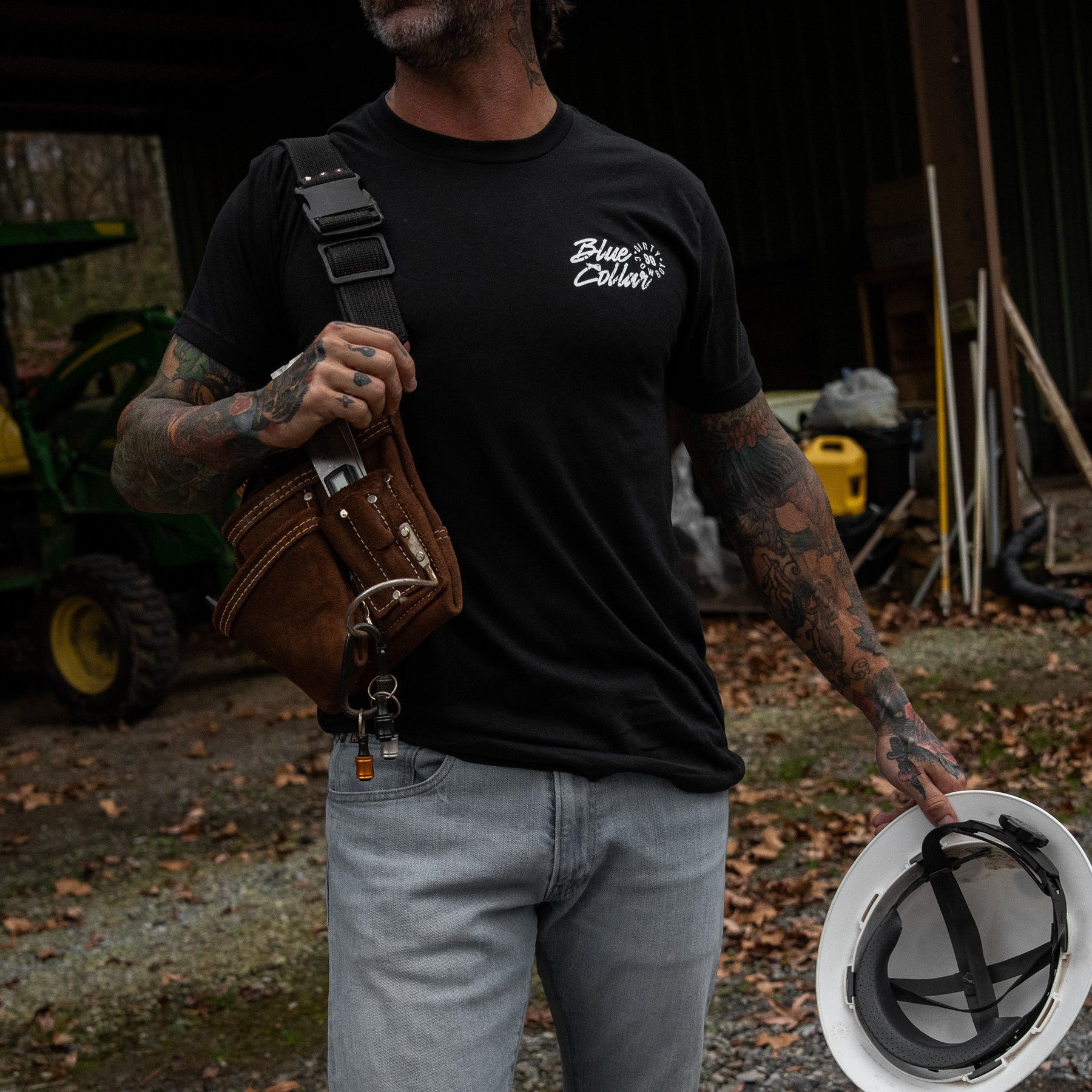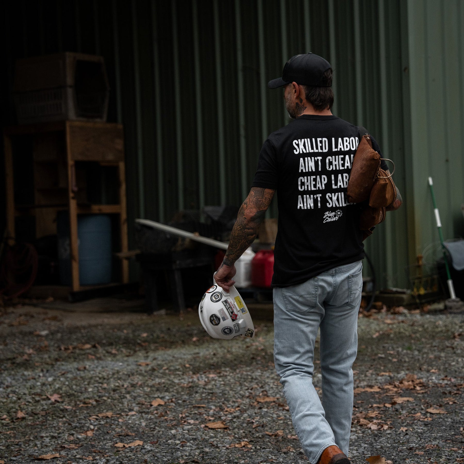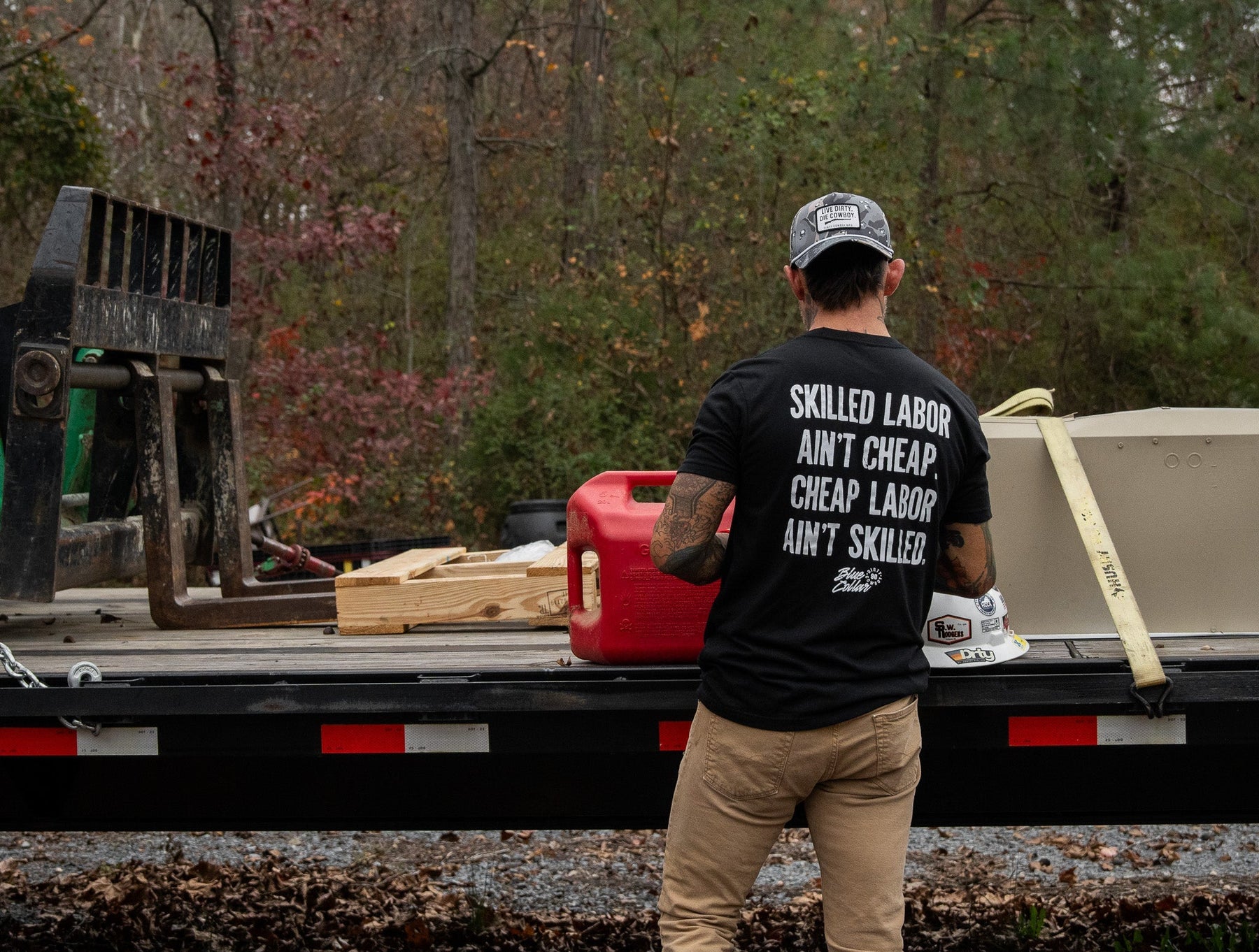 Our tees are made with a 60/40 cotton-poly blend — soft enough to feel broken-in from day one, but tough enough to stand up to real life.