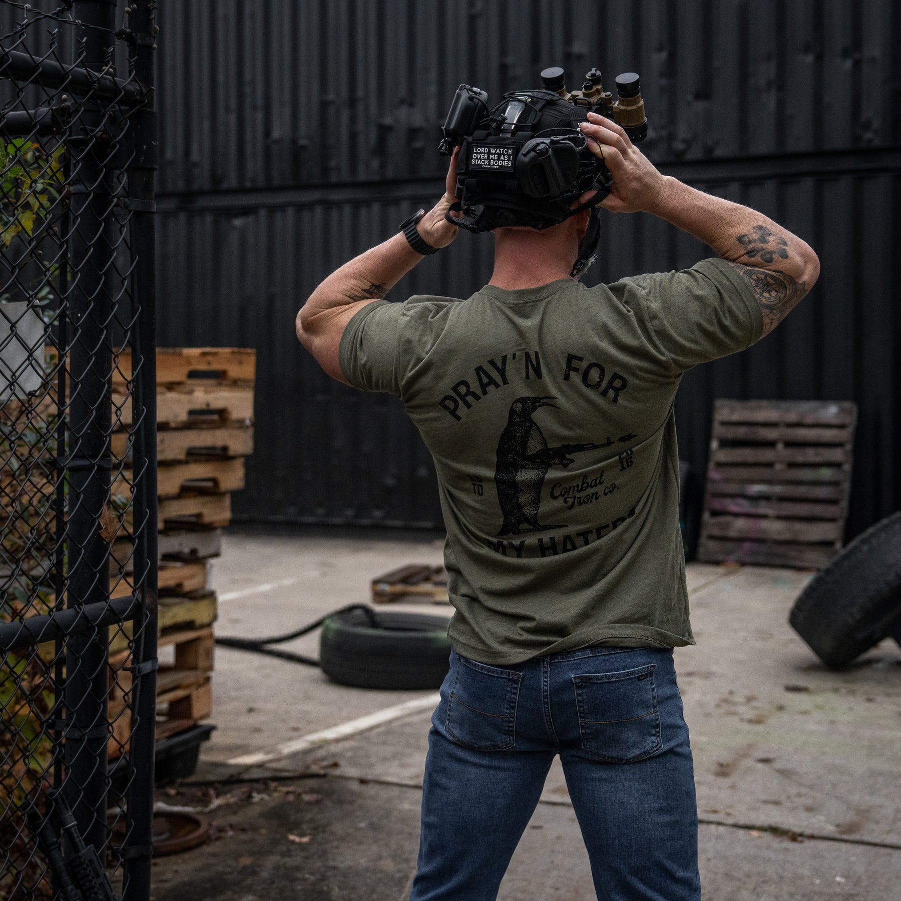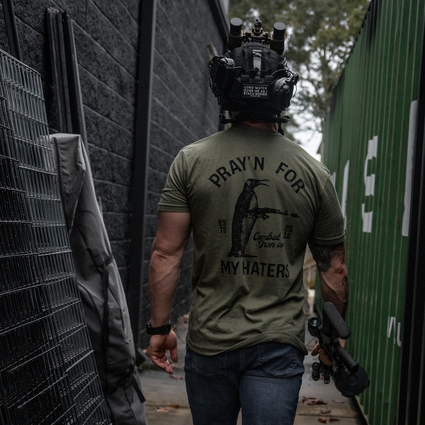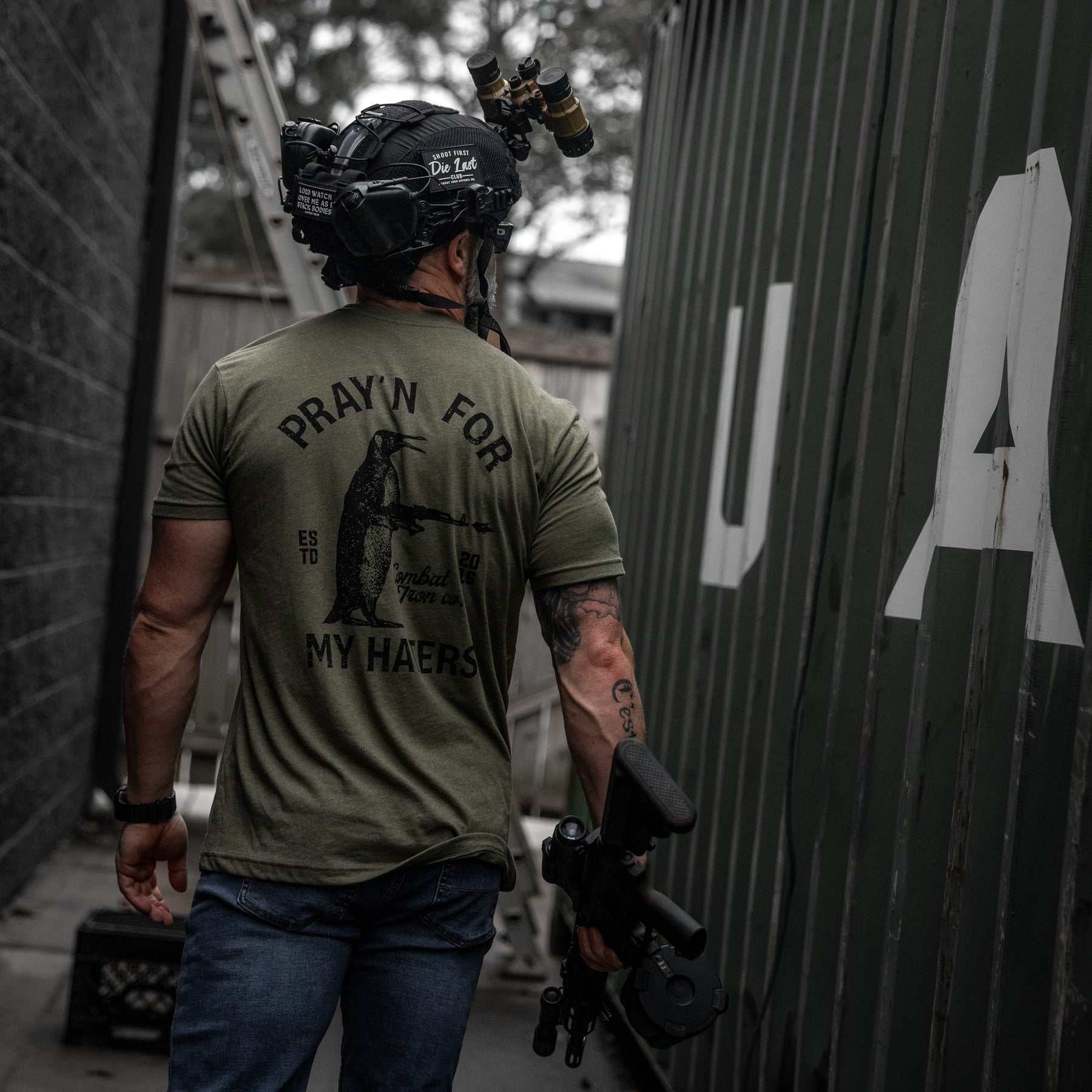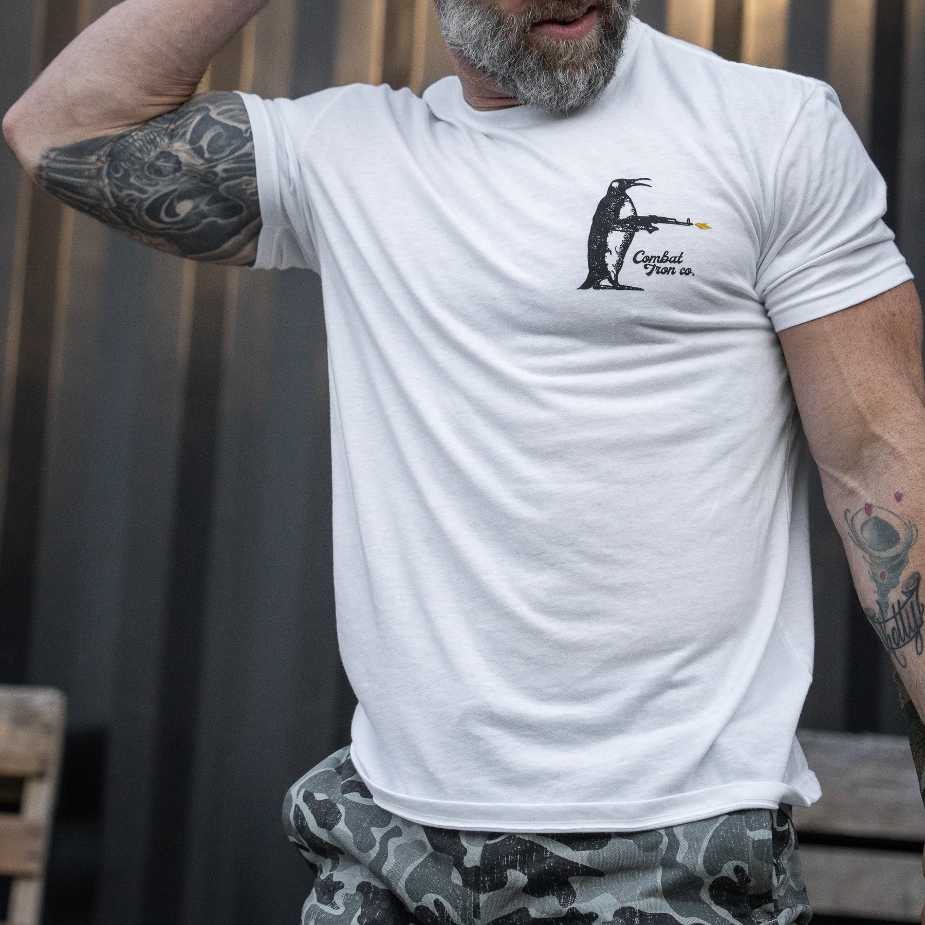 Our tees are made with a 60/40 cotton-poly blend — soft enough to feel broken-in from day one, but tough enough to stand up to real life.