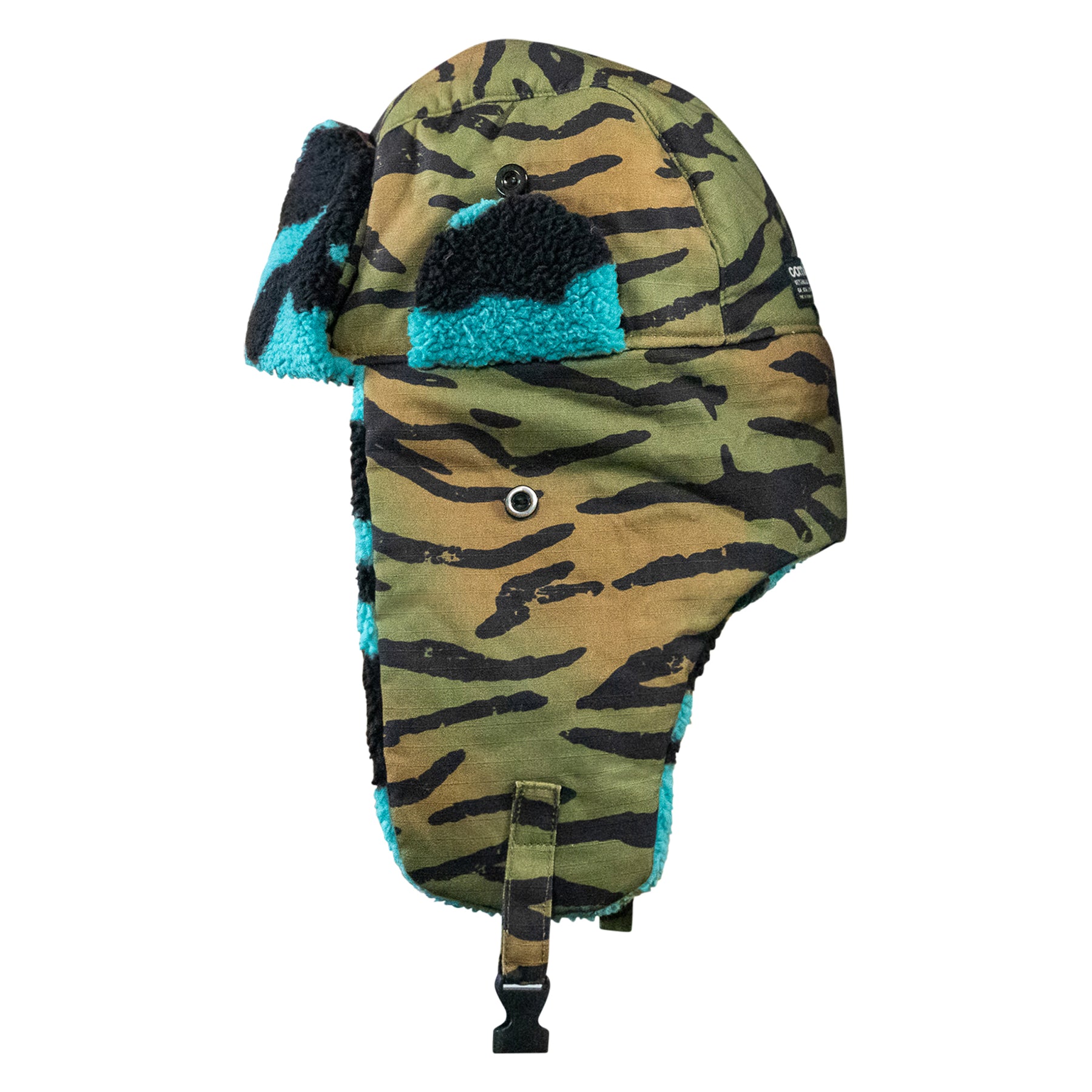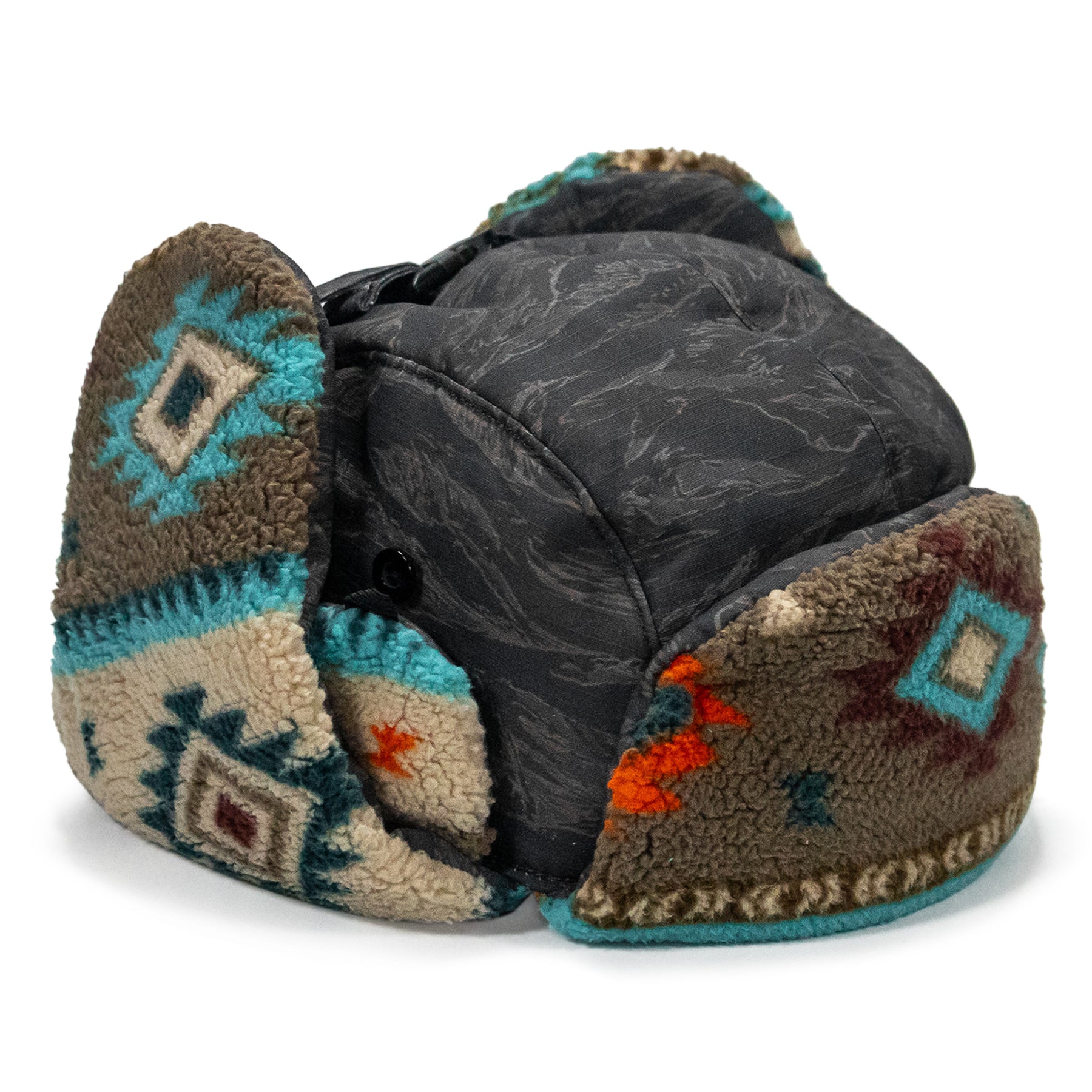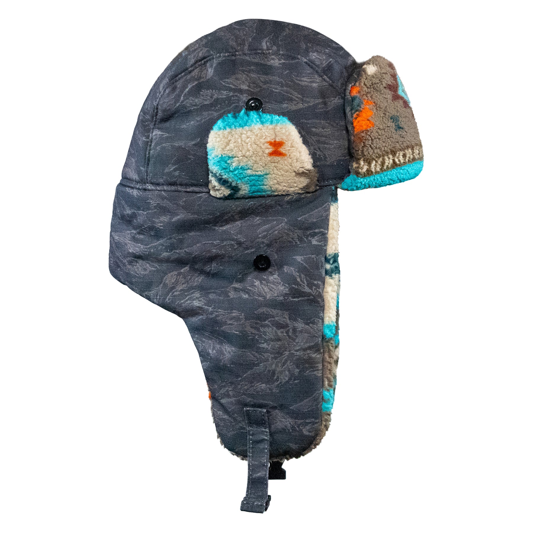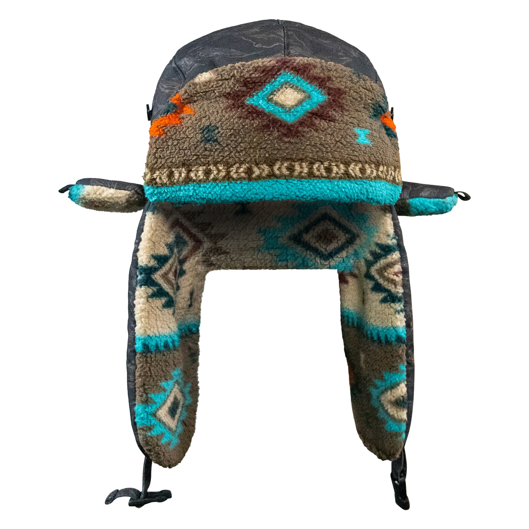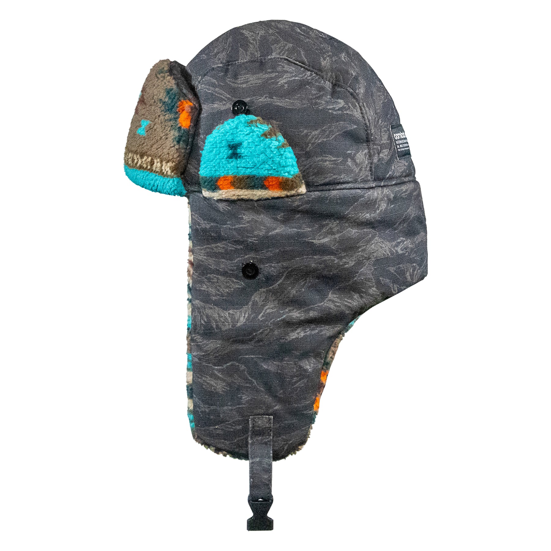 Securable ear flaps up or down with buckle closure keeping warmth and comfort ready.