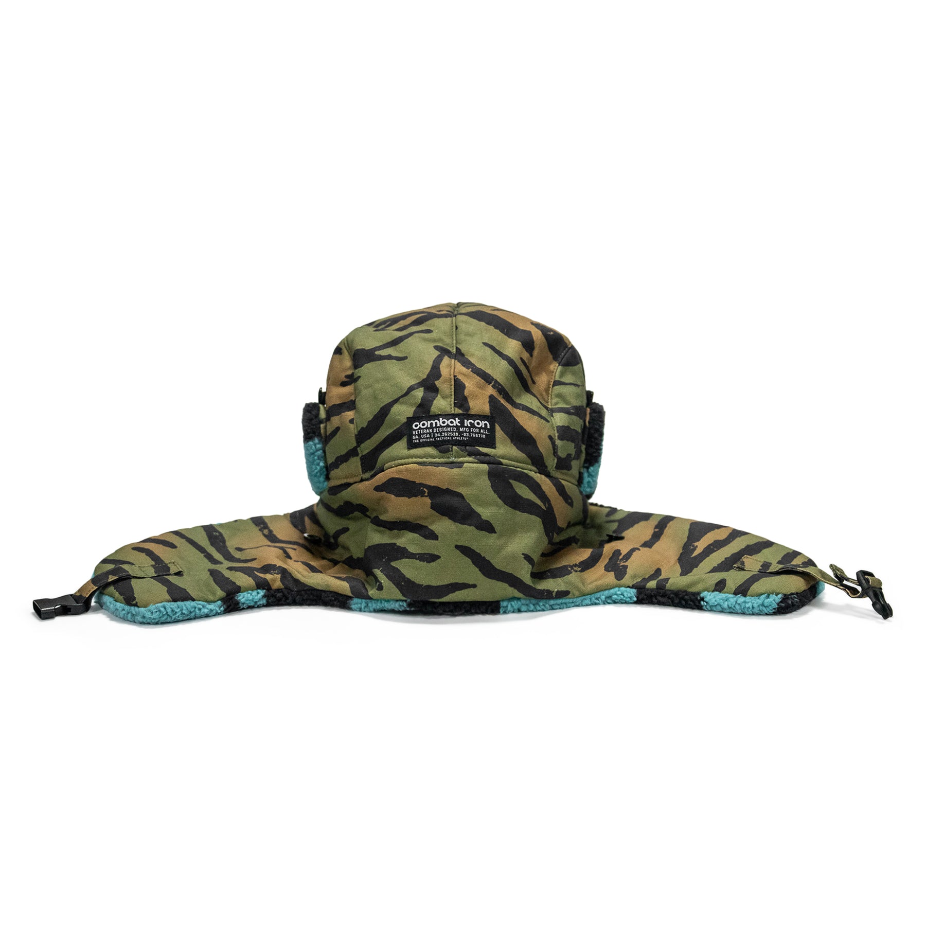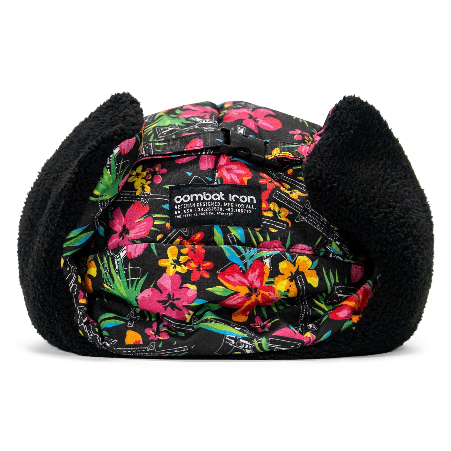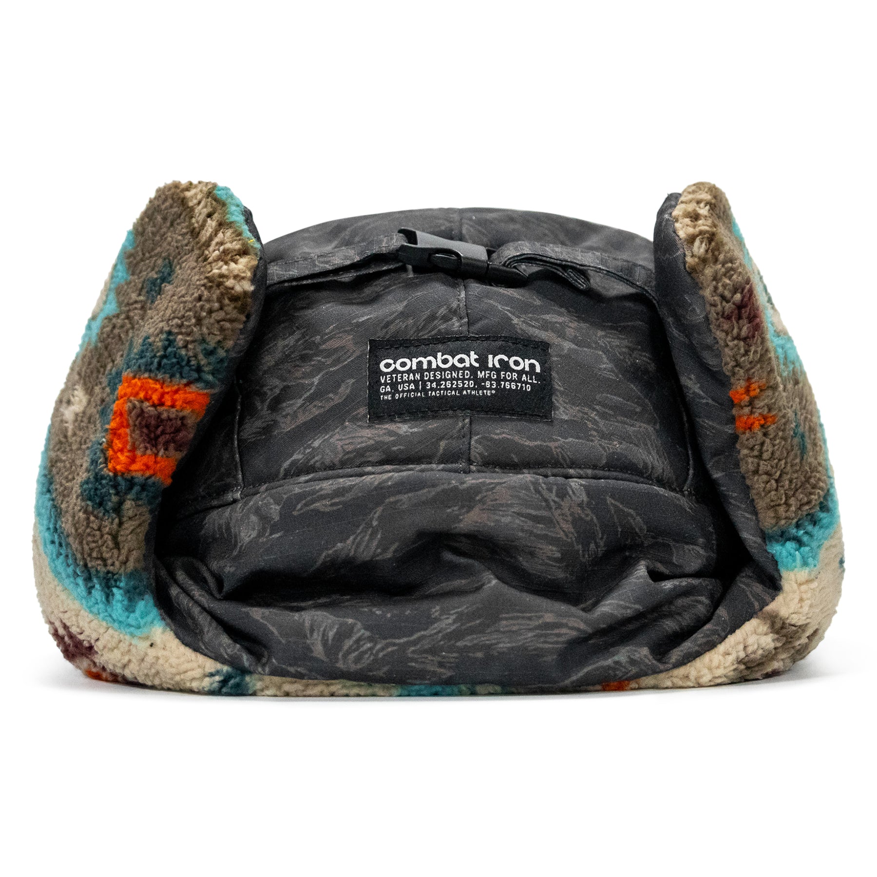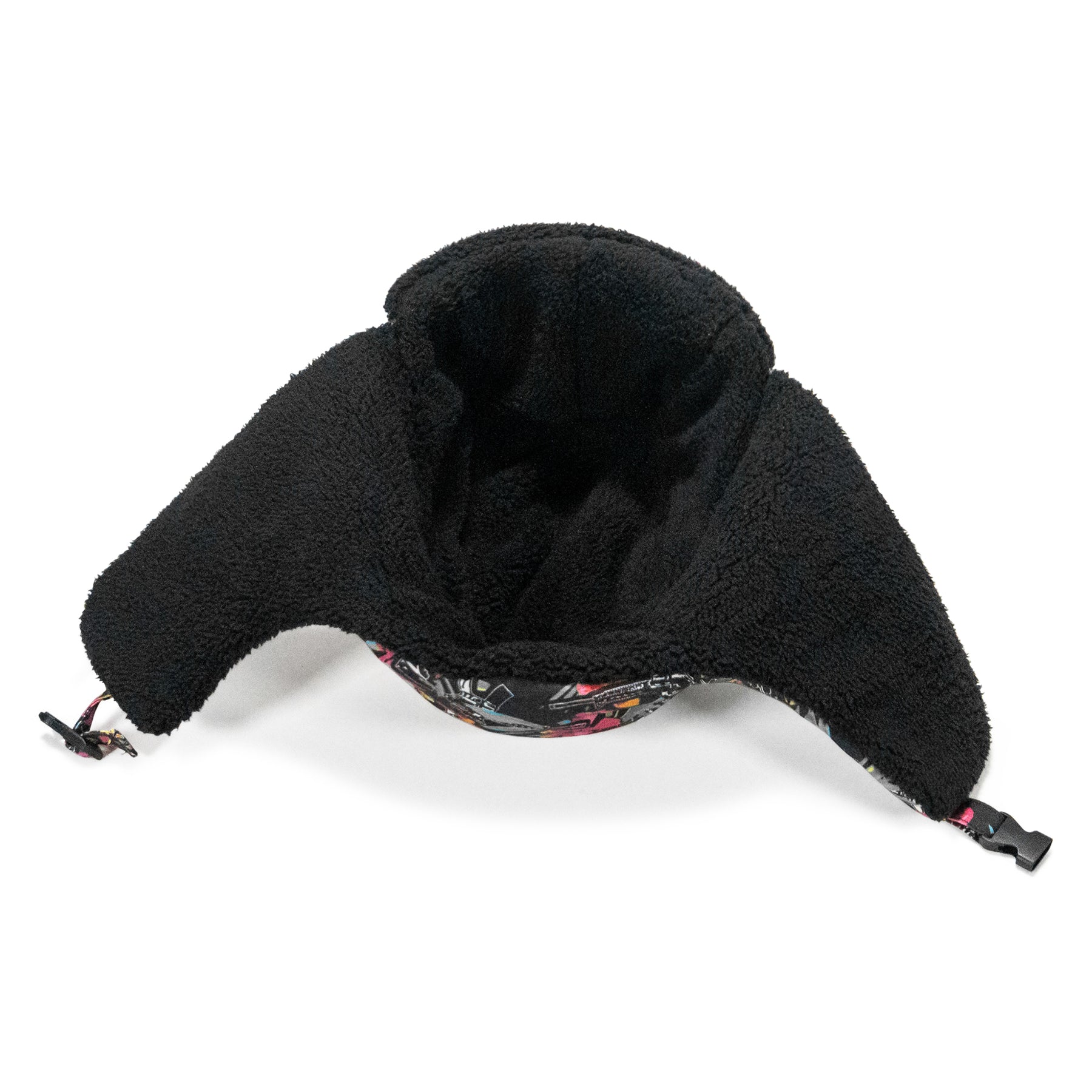 Securable ear flaps up or down with buckle closure keeping warmth and comfort ready.