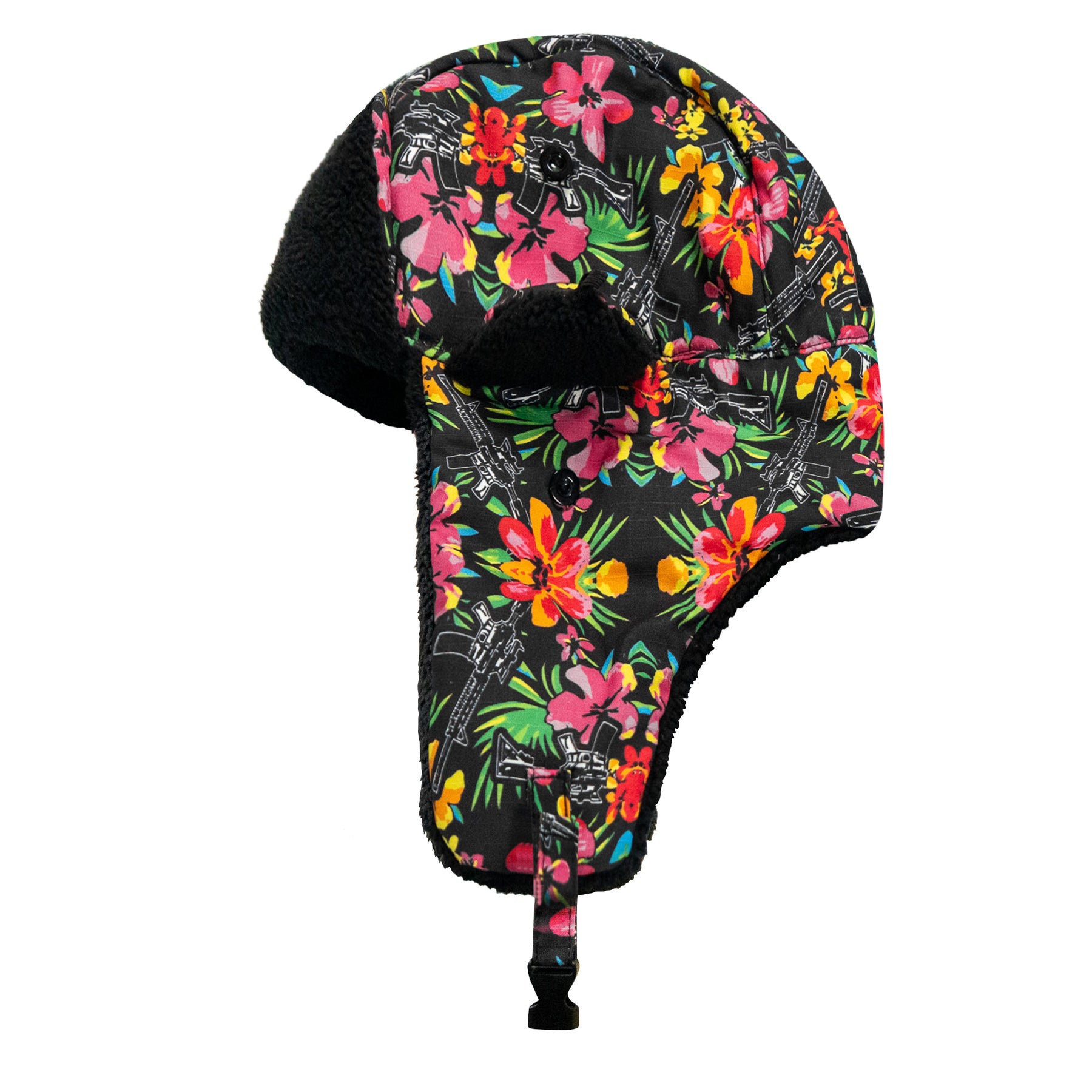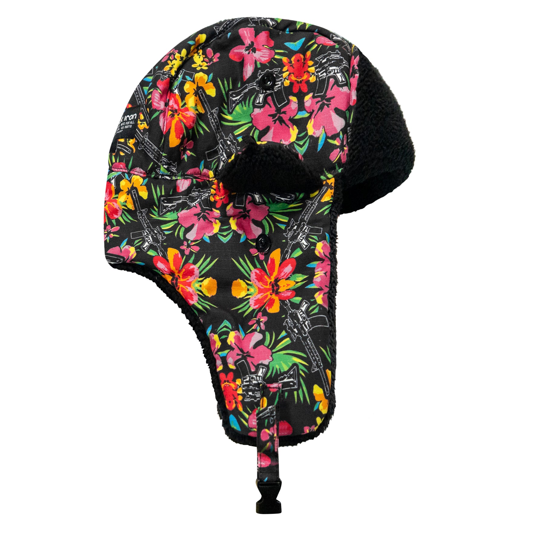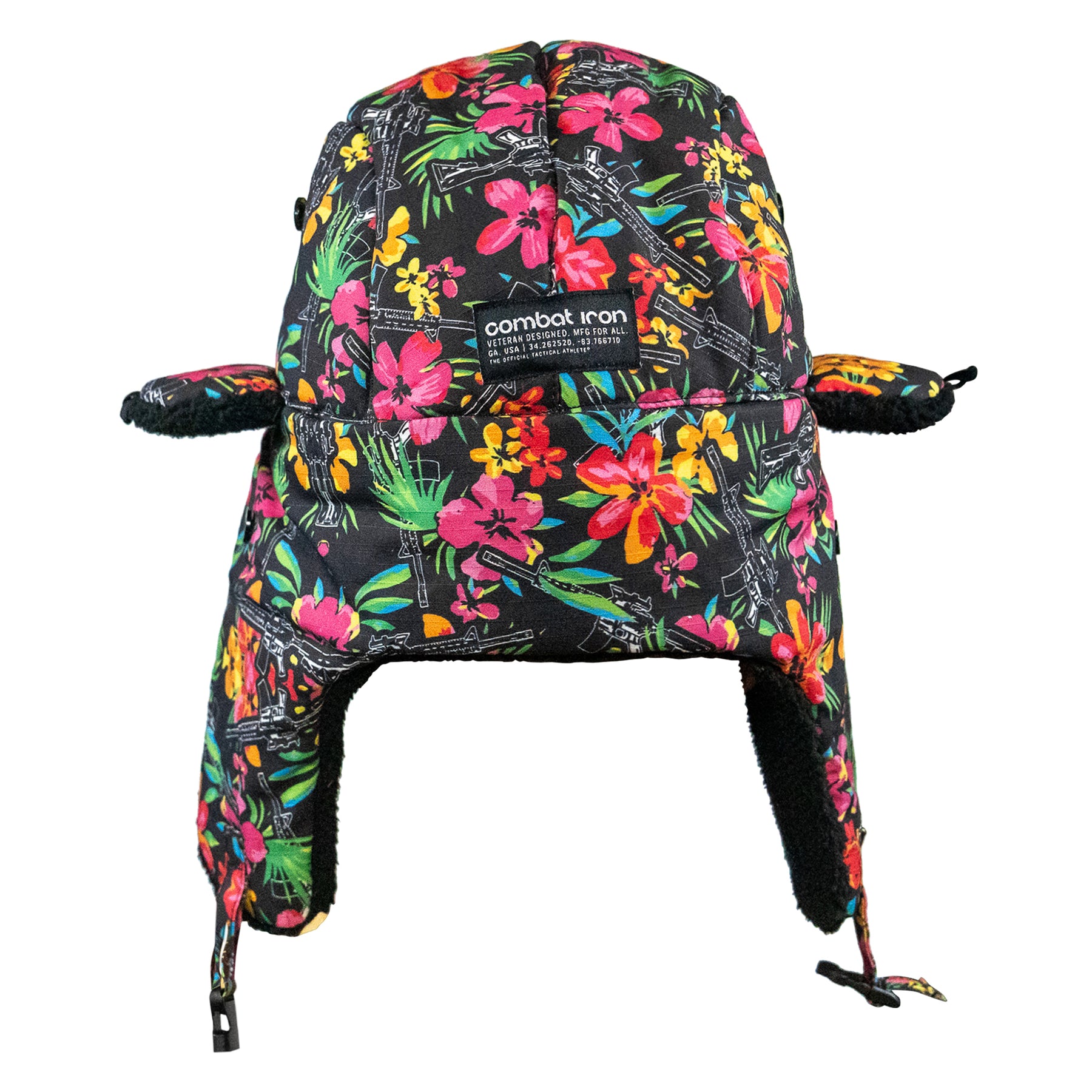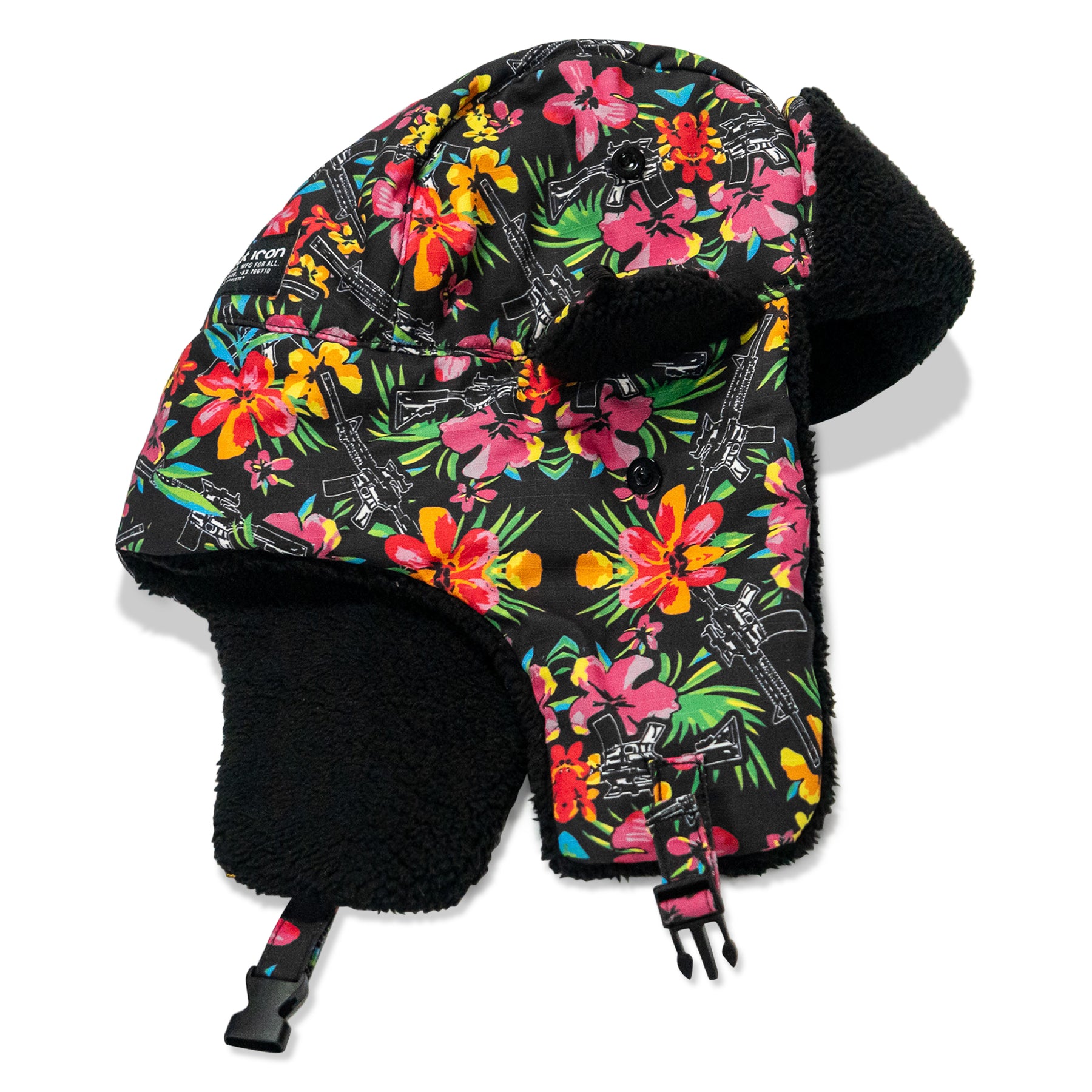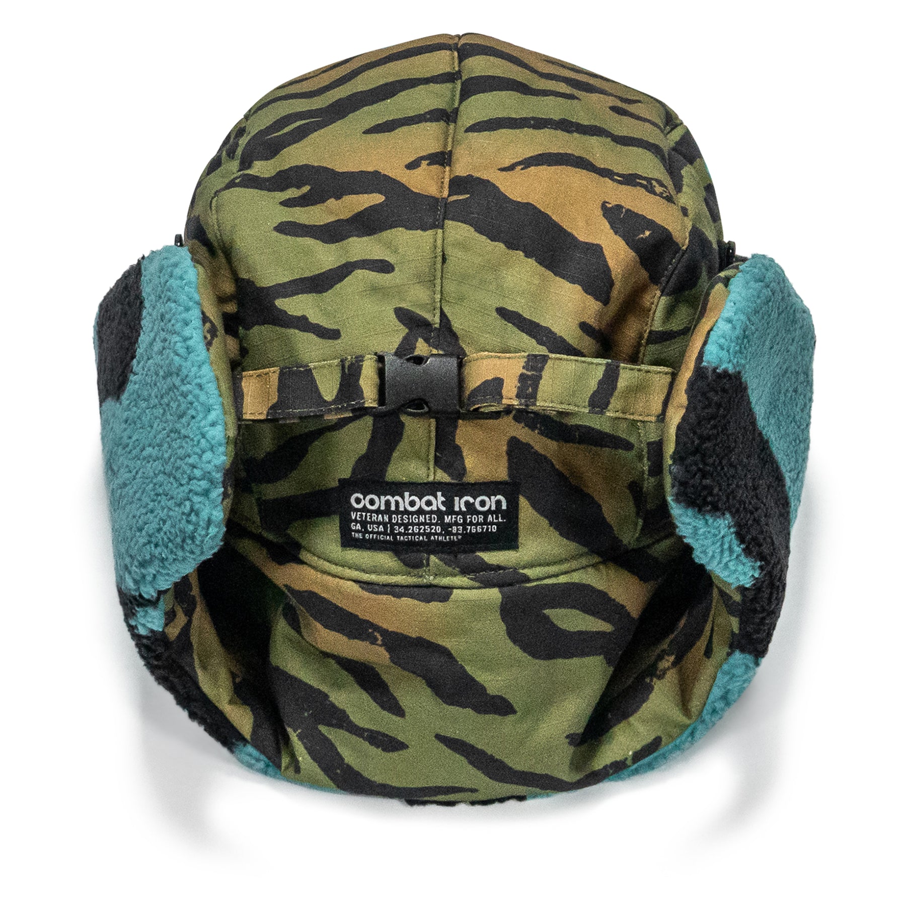 Securable ear flaps up or down with buckle closure keeping warmth and comfort ready.