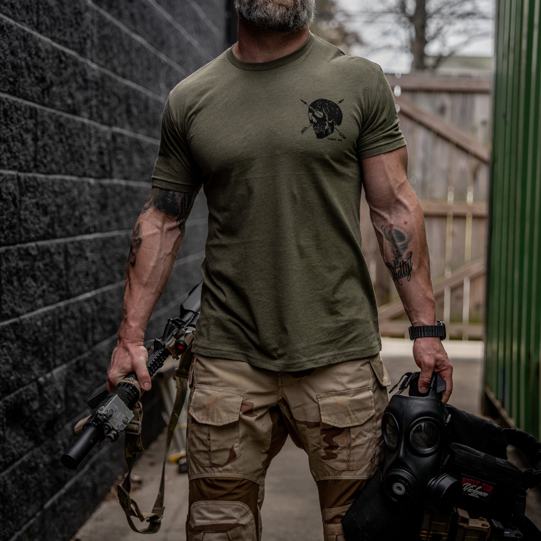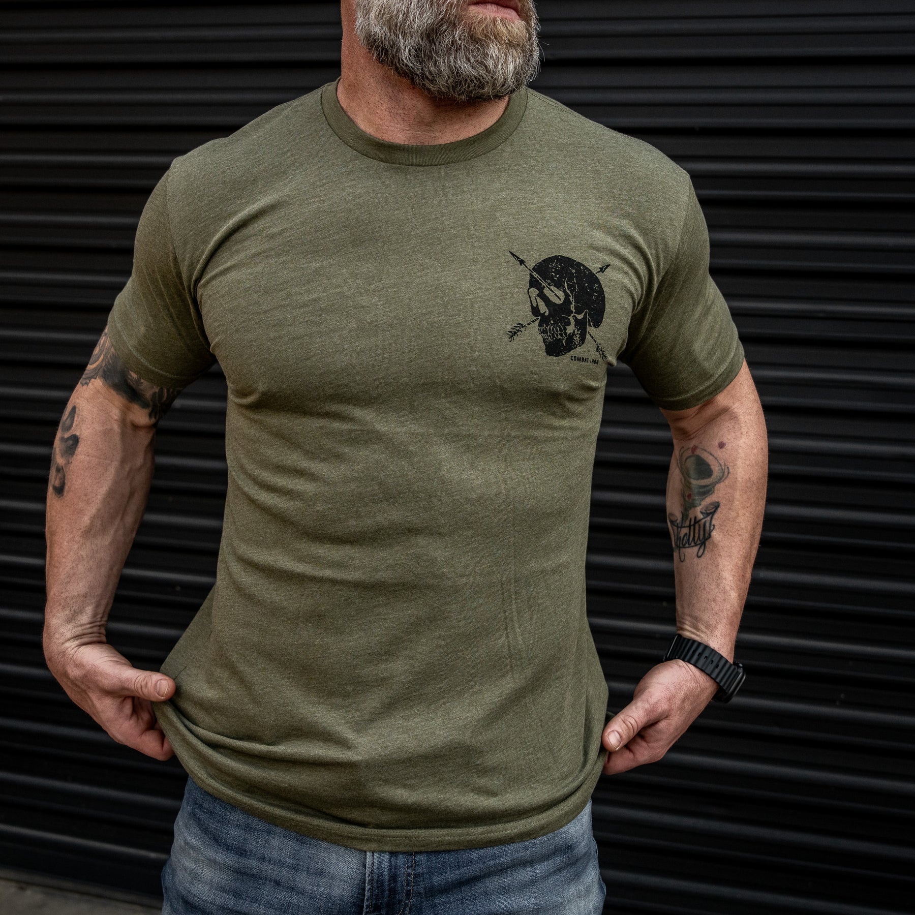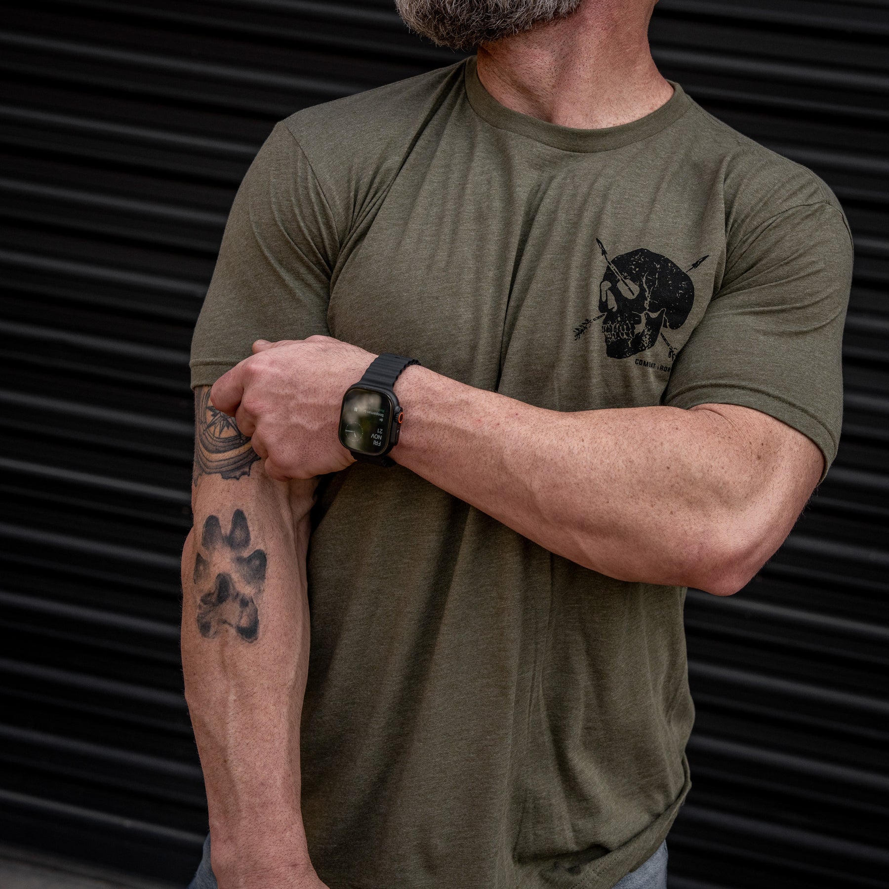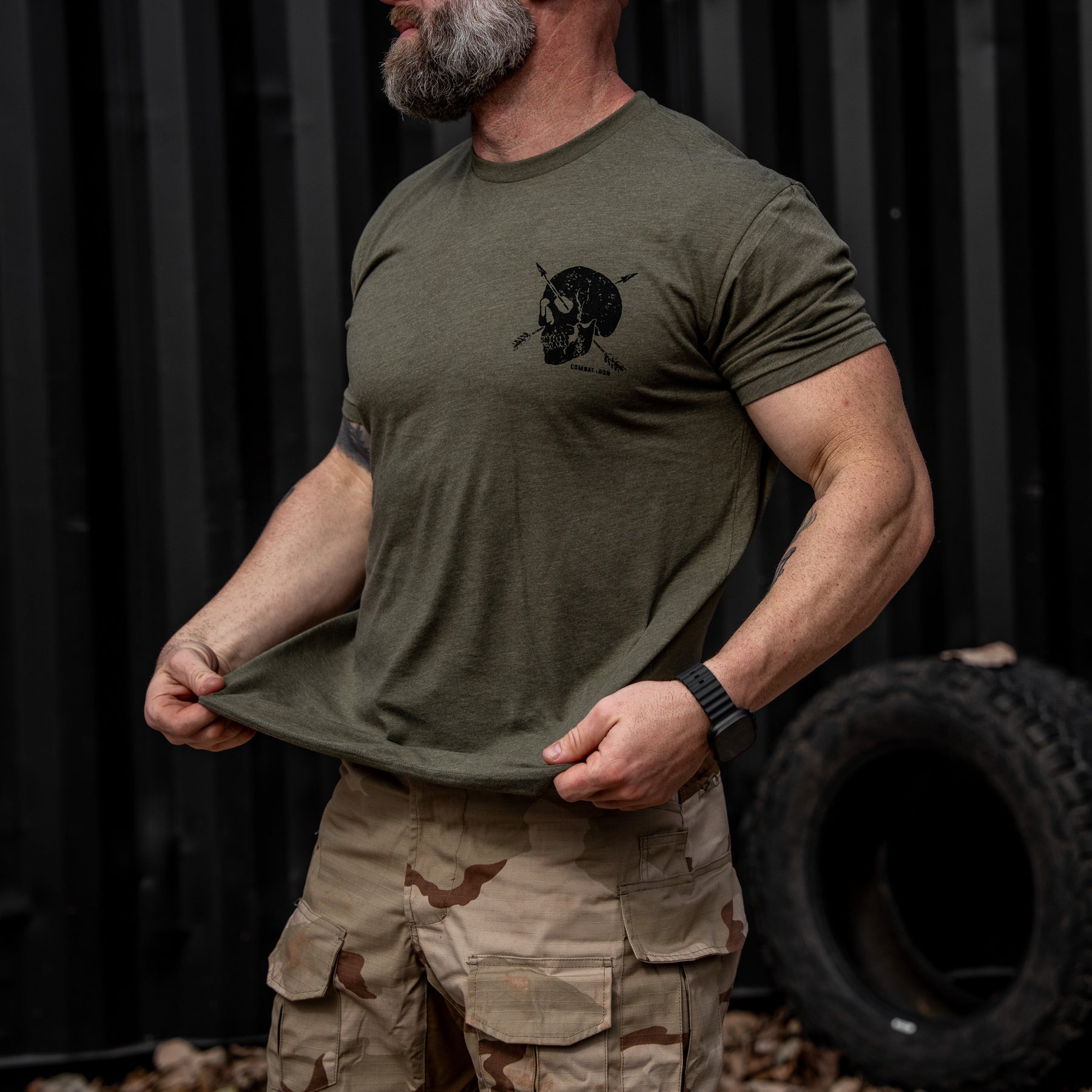 Your upgraded modern go-to tee for training, operating, traveling, and everything in between. Engineered from a soft spun pre-laundered 60/40 cotton-poly blend, this shirt delivers a broken-in feel from day one and keeps its athletic shape wear after wear.