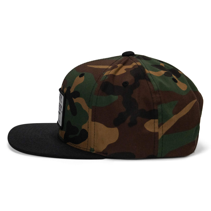 Styled with a structured six-panel design, reinforced front panels, and a flat bill, this snapback delivers a bold, defined silhouette that holds its form in any setting—no curve, no compromise.