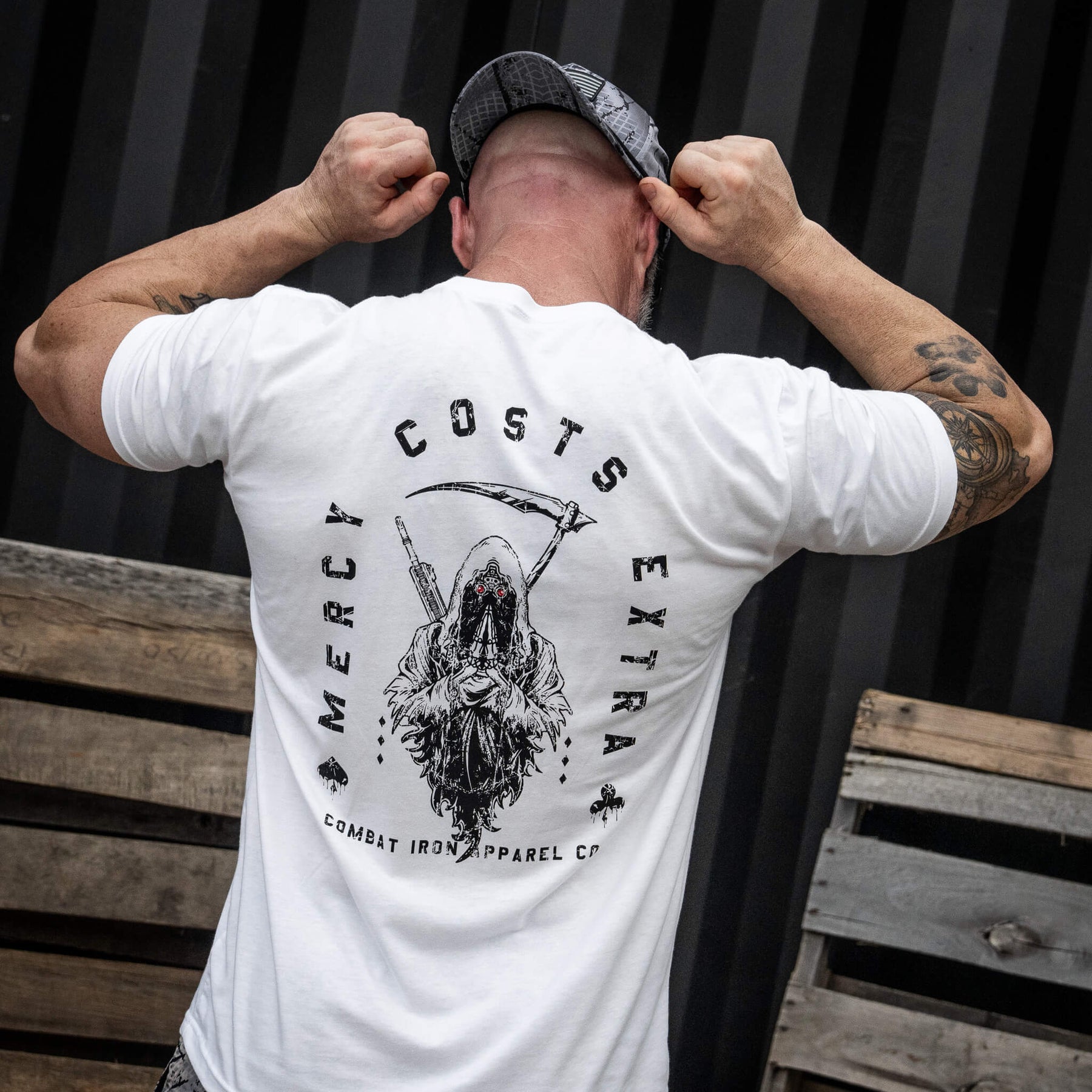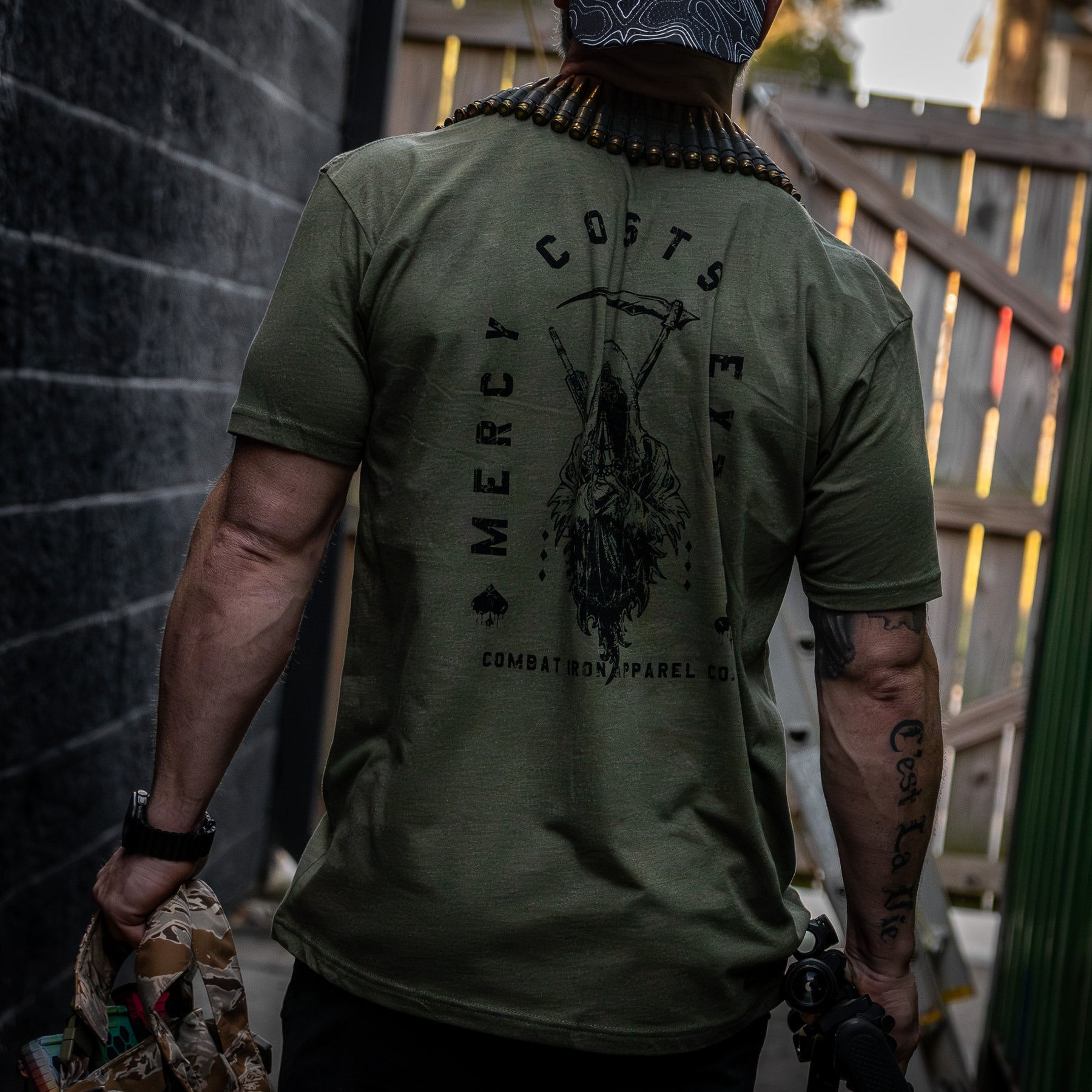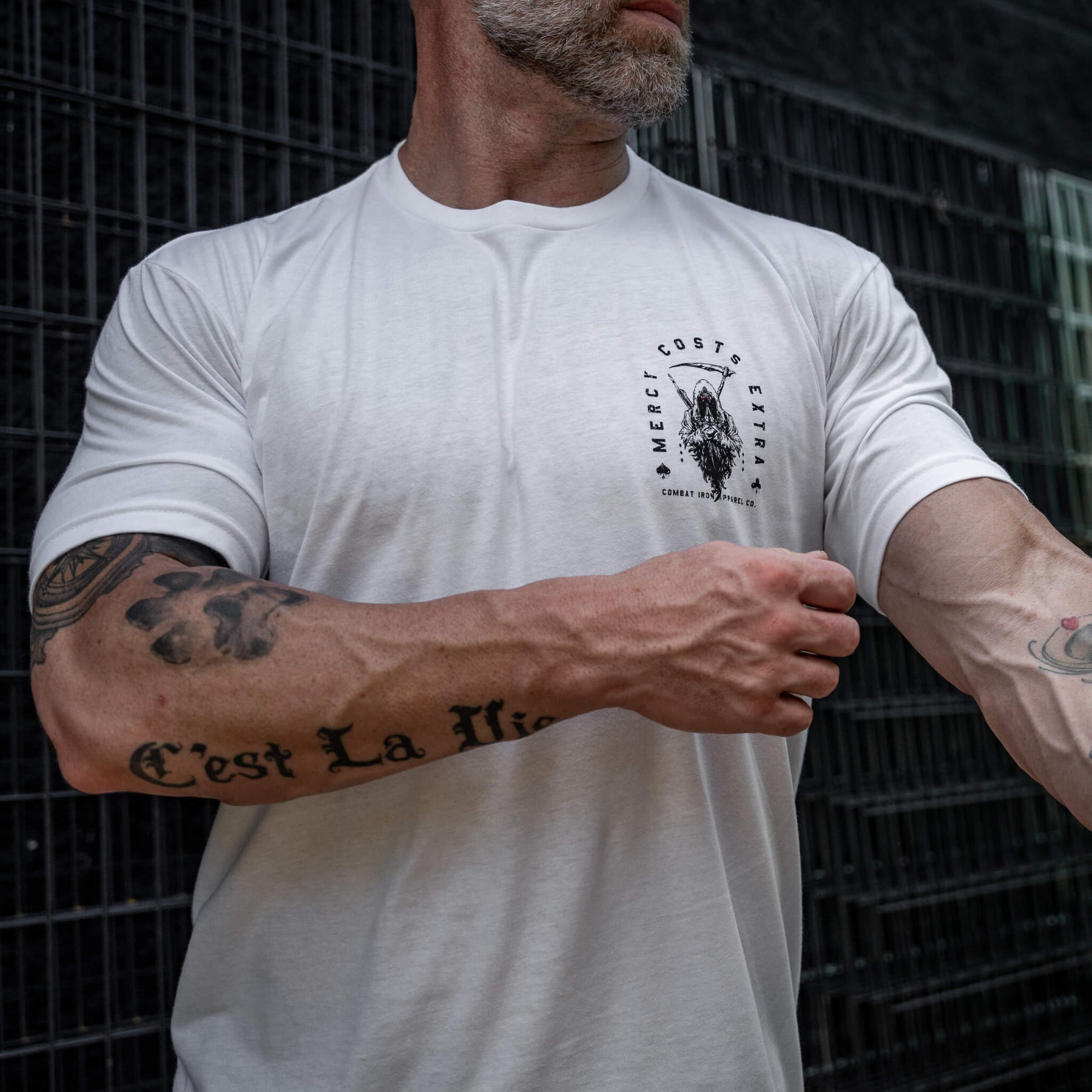 Our tees are made with a 60/40 cotton-poly blend — soft enough to feel broken-in from day one, but tough enough to stand up to real life.
