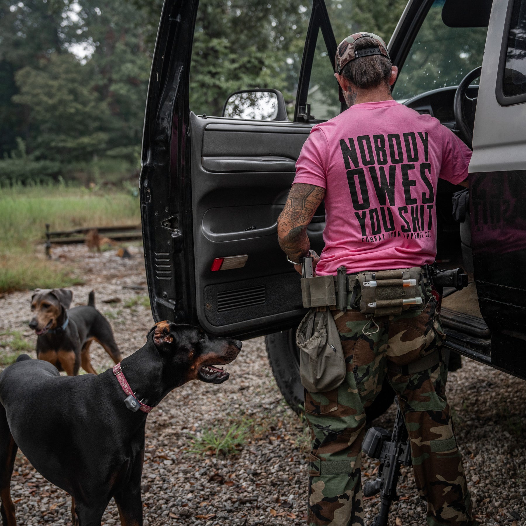 Our tees are made with a 60/40 cotton-poly blend — soft enough to feel broken-in from day one, but tough enough to stand up to real life.