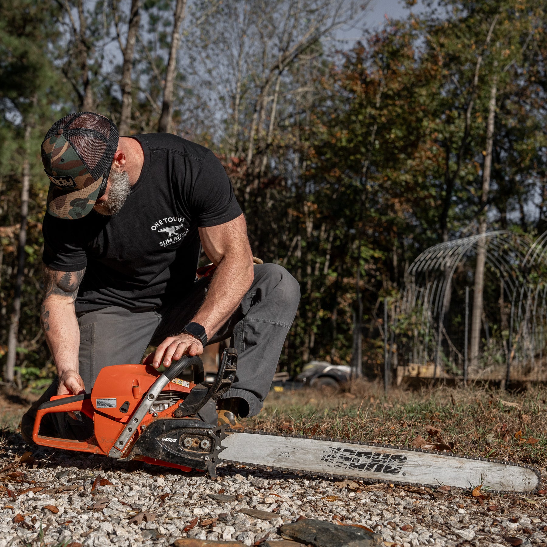 Our tees are made with a 60/40 cotton-poly blend — soft enough to feel broken-in from day one, but tough enough to stand up to real life.